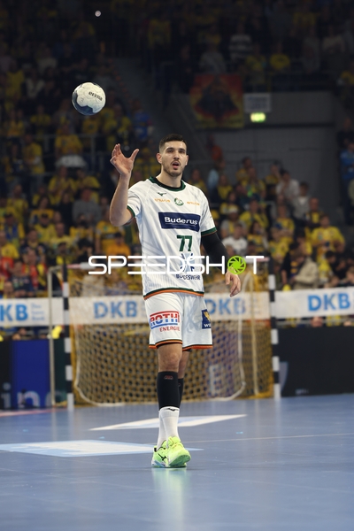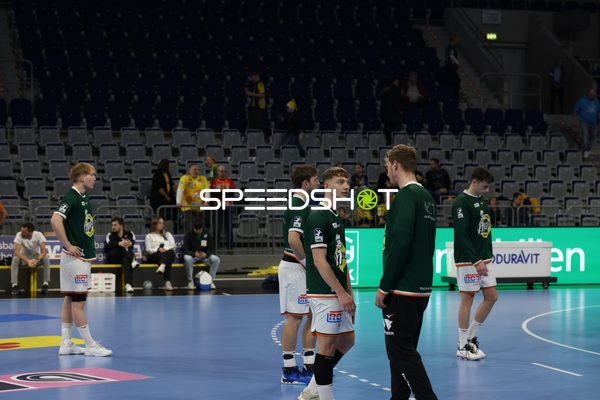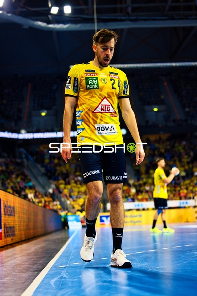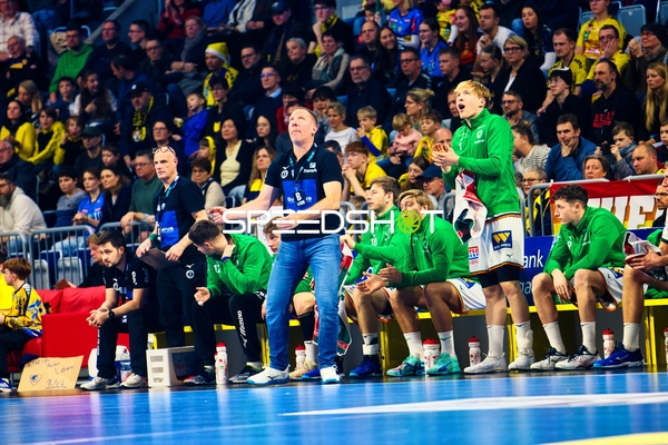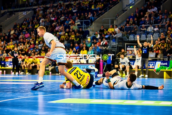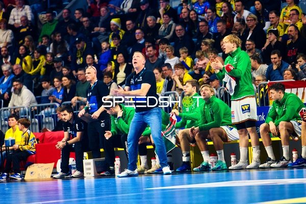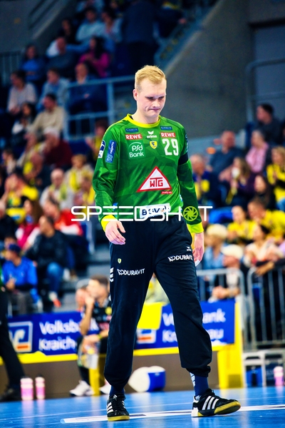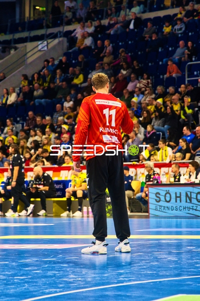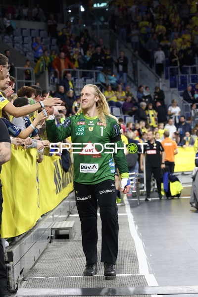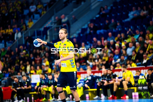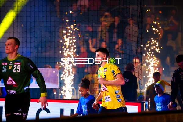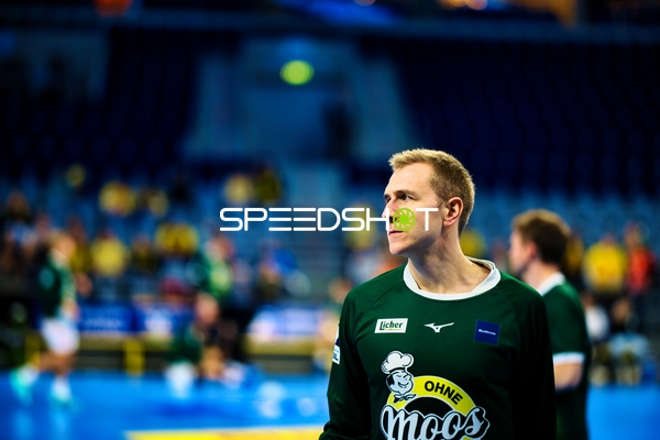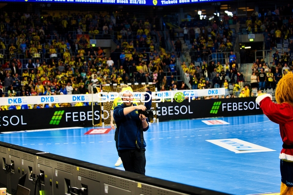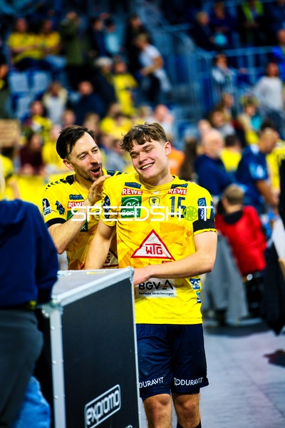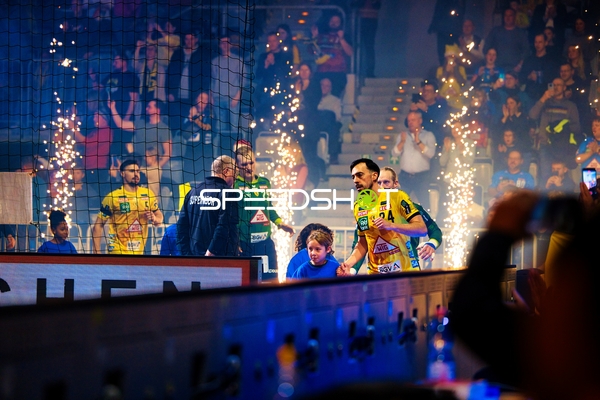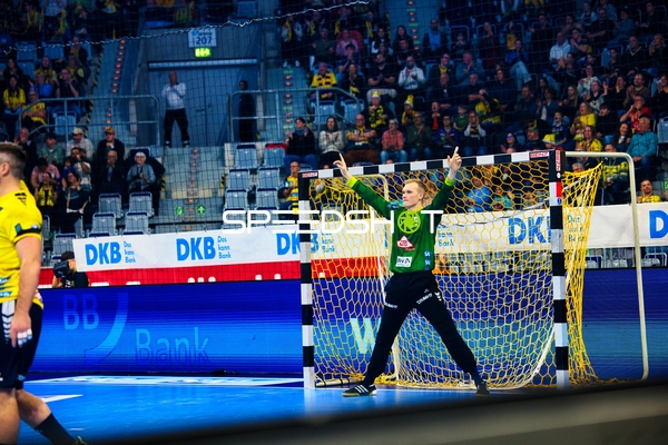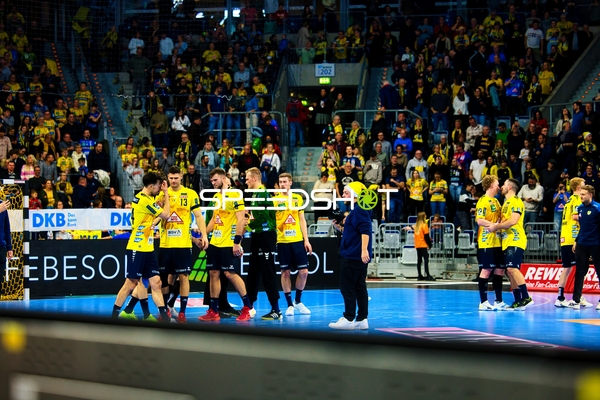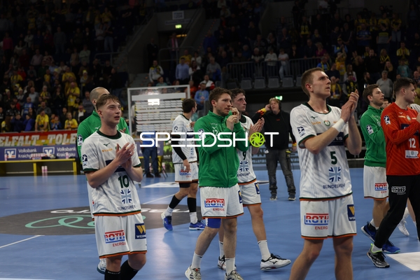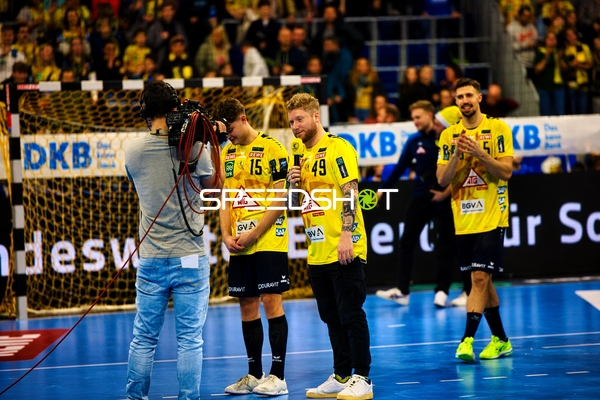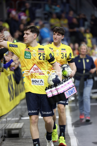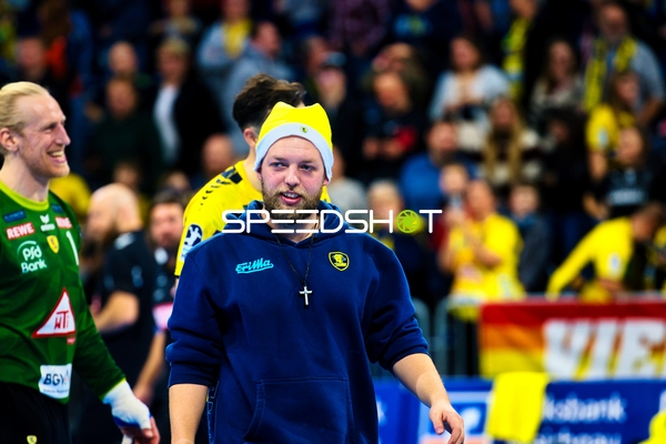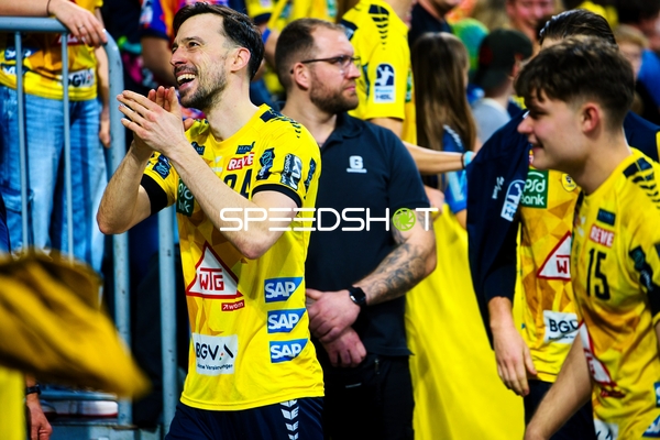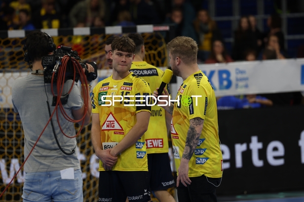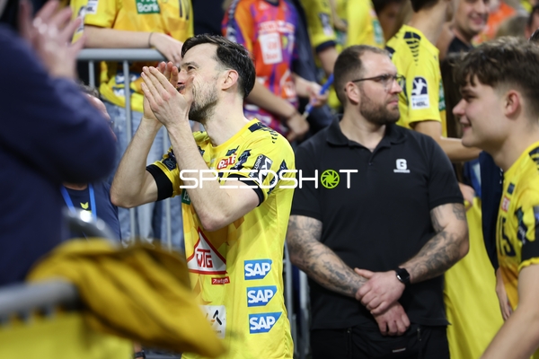 Ein Spieler der Rhein Neckar Löwen ist in Interaktion mit dem Publikum, möglicherweise applaudierend oder dankend.