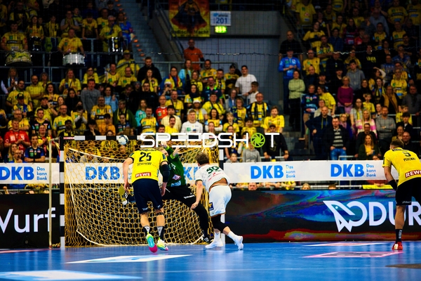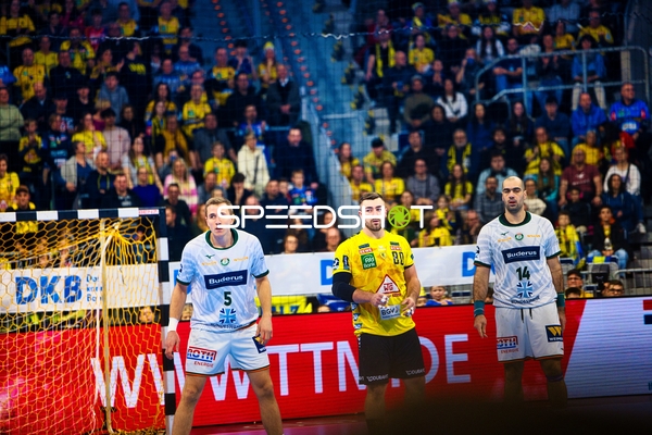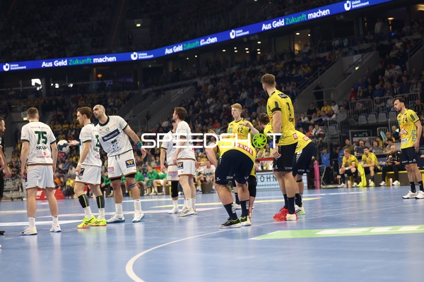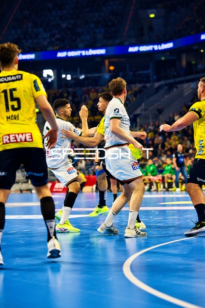 Ein Spieler von Rhein Neckar Löwen versucht, den Ball unter Bedrängnis von HSG Wetzlar Spielern zu passen.