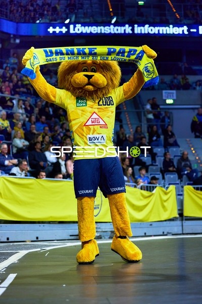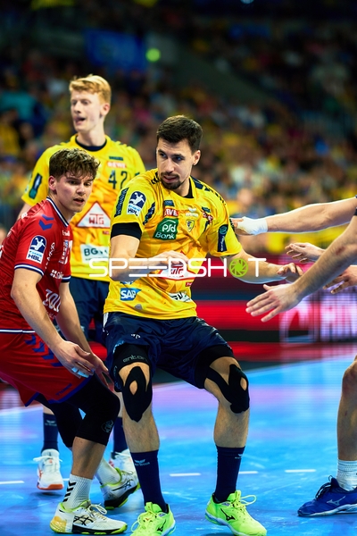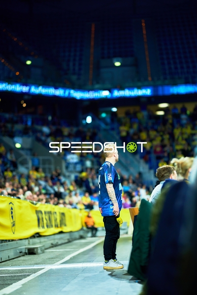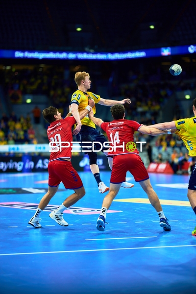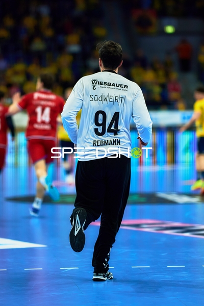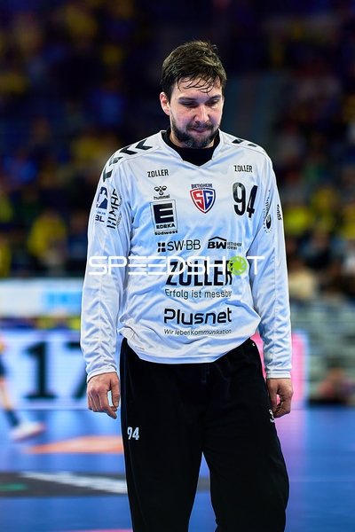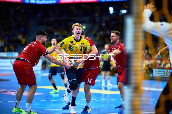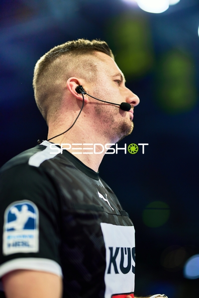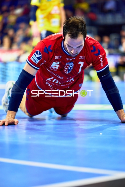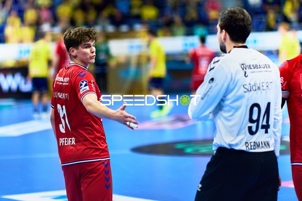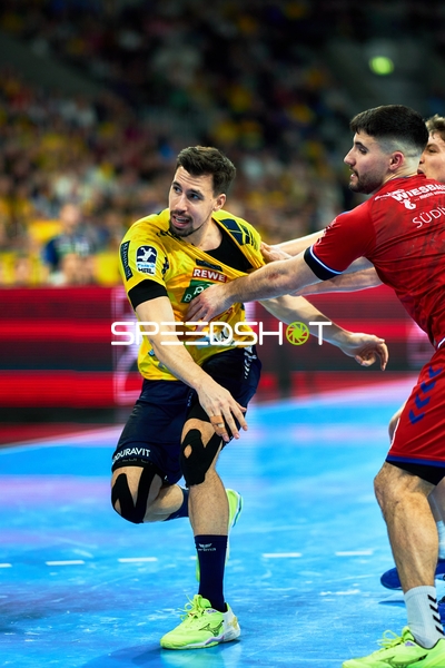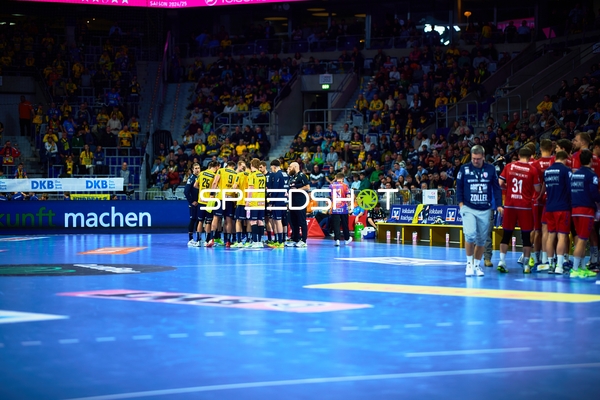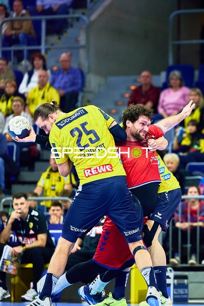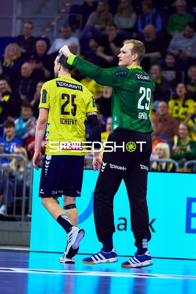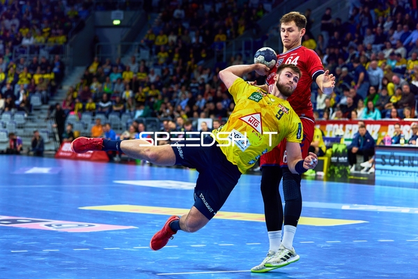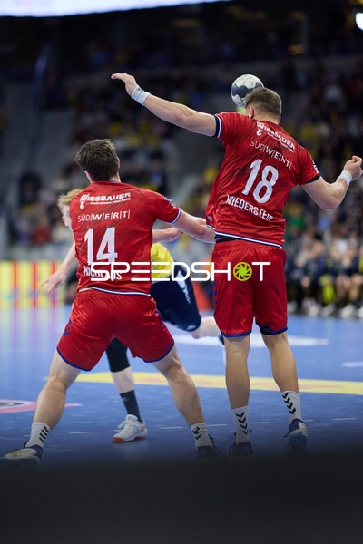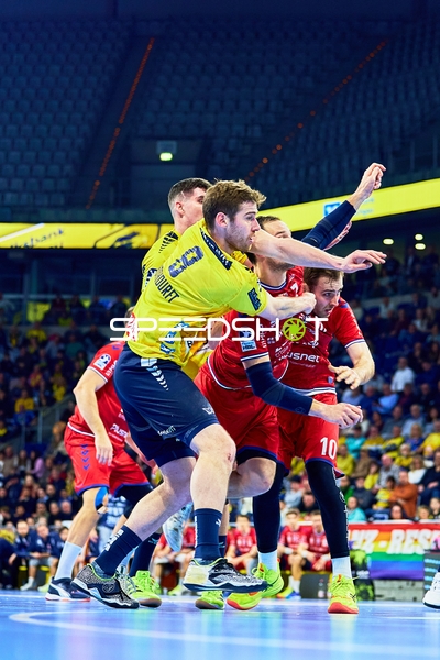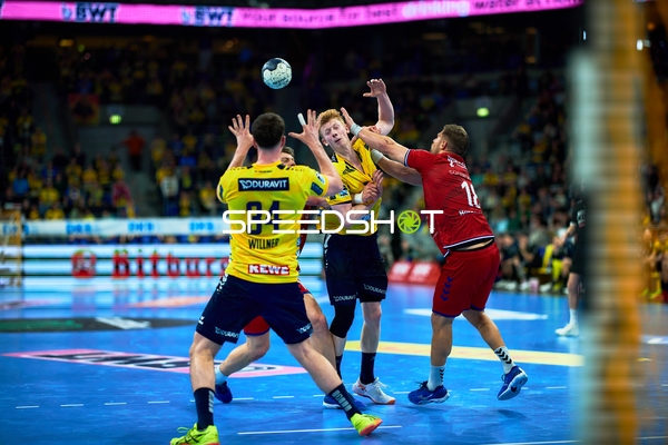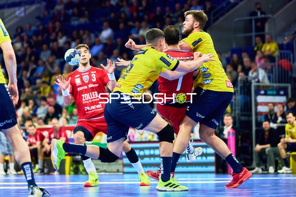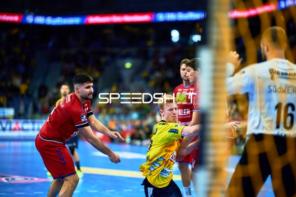 Ein Zweikampf im Handballspiel, bei dem Spieler der Rhein Neckar Löwen versuchen, durch die Verteidigung von SG BBM Bietigheim zu brechen.