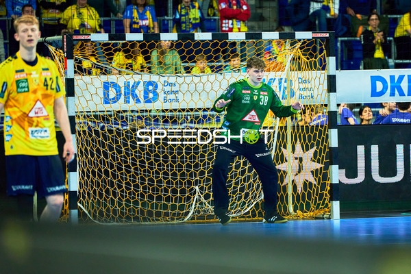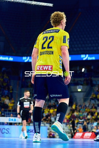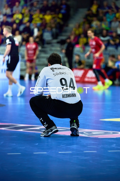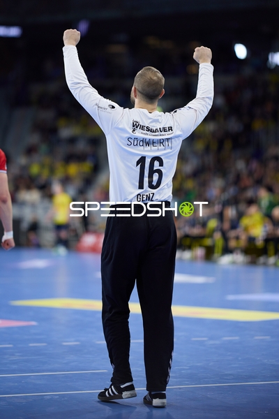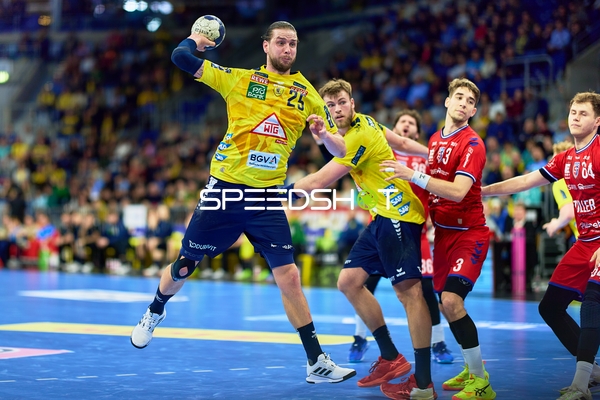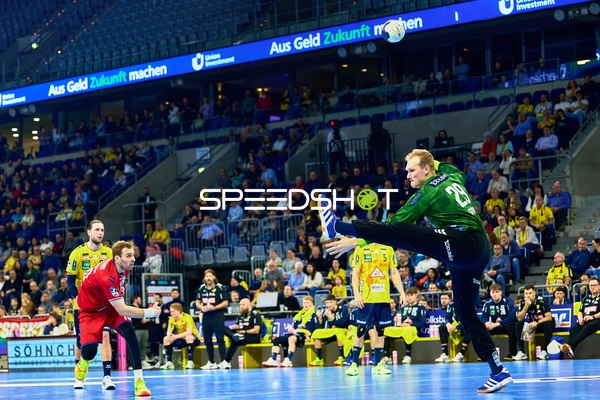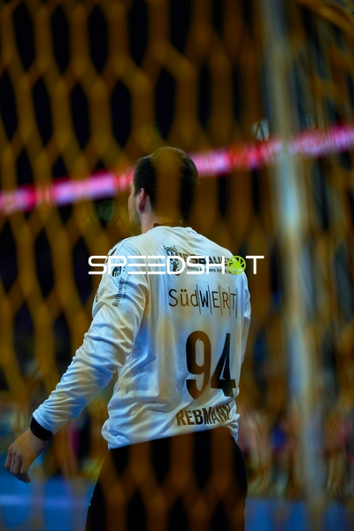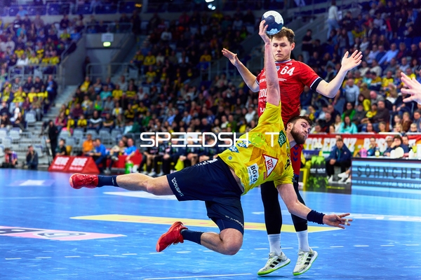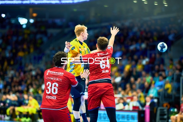 Ein Spieler von Rhein Neckar Löwen springt zum Wurf, während zwei Spieler von SG BBM Bietigheim versuchen zu blocken.