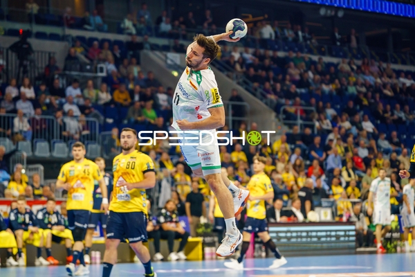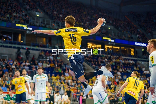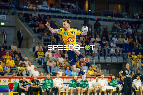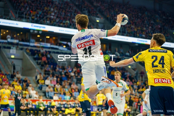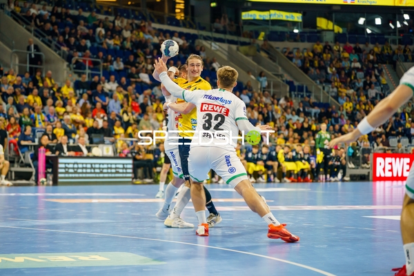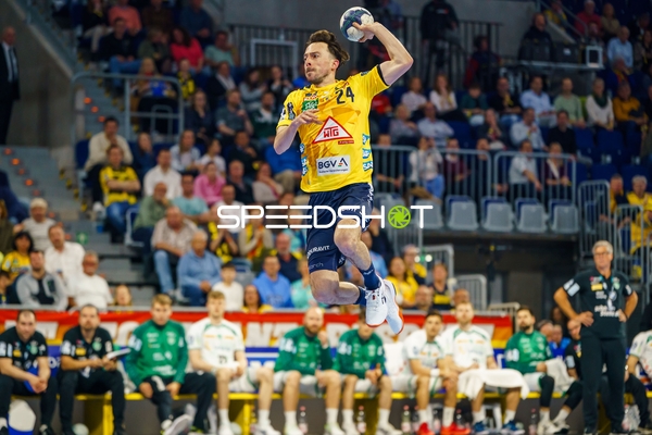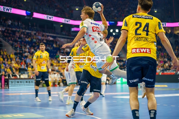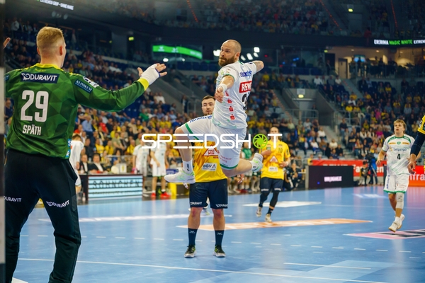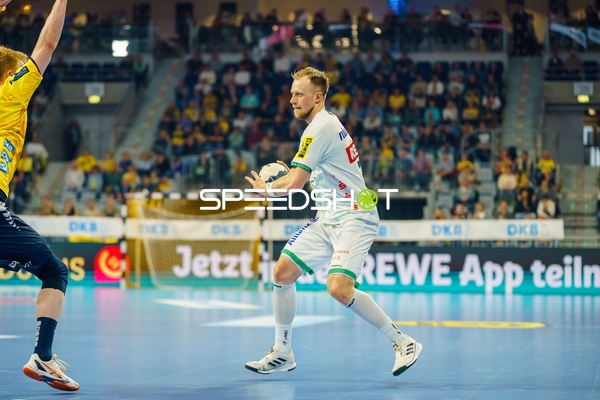 Lukas Binder (11, SC DHfK Leipzig) mit Sprungwurf, Patrick Groetzki (24, Rhein Neckar Löwen) verteidigt