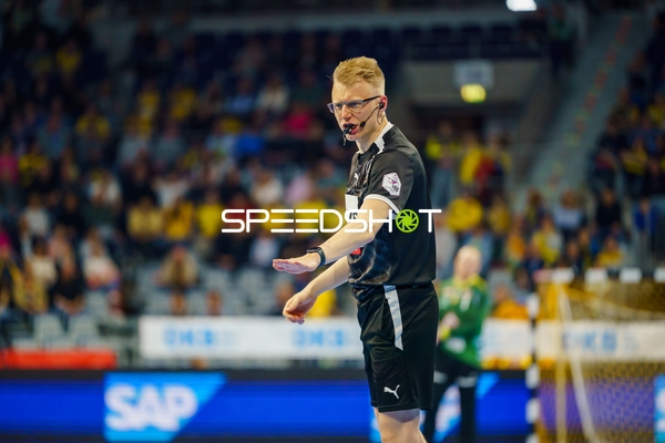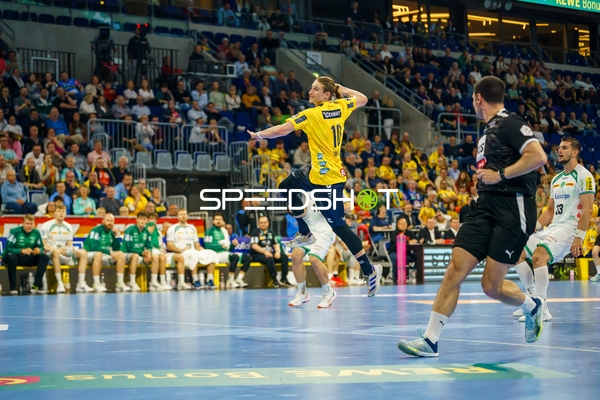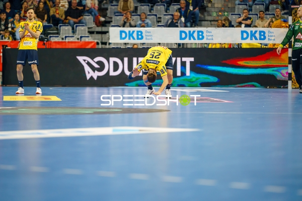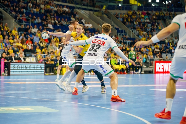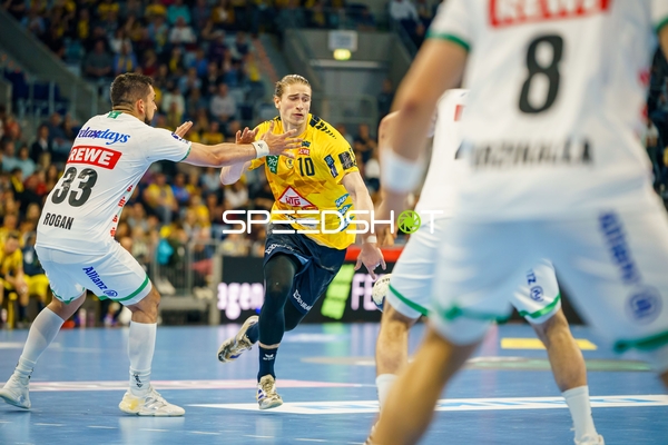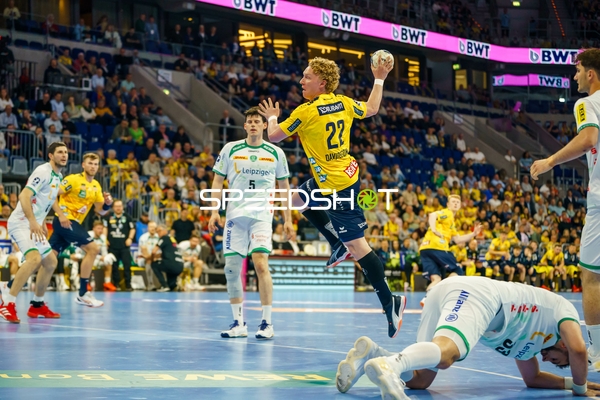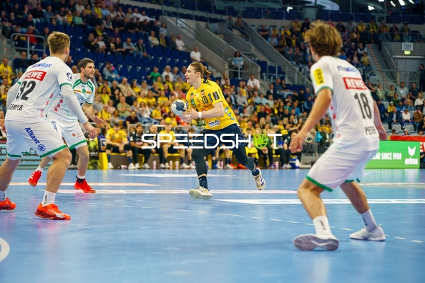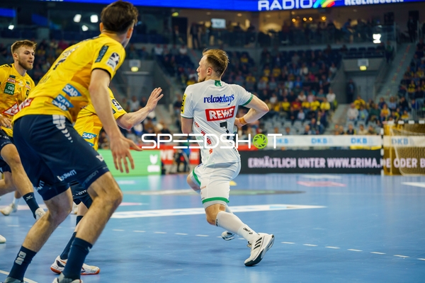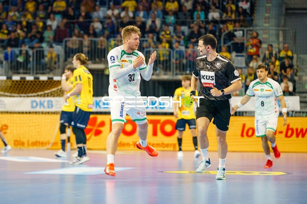 Juri Knorr (10, Rhein Neckar Löwen) mit Ball, verteidigt von Franz Semper (32, SC DHfK Leipzig) und Staffan Peter (18, SC DHfK Leipzig)