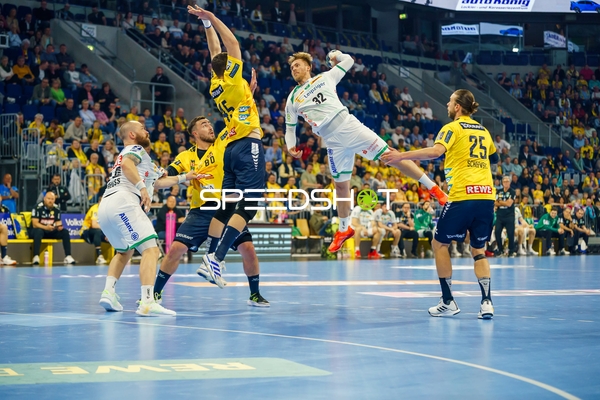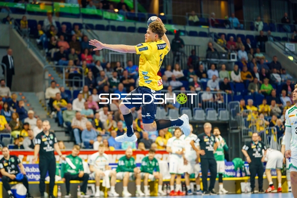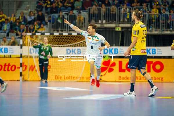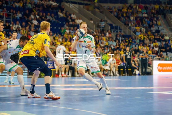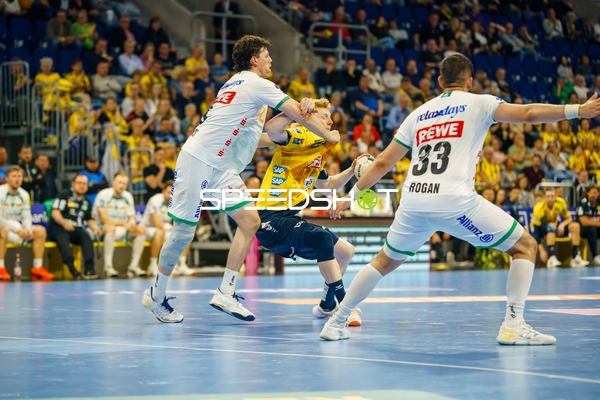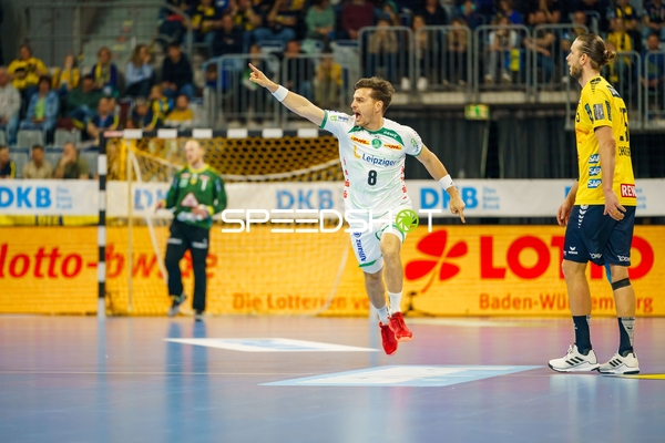 Luca Witzke (7, SC DHfK Leipzig) im Angriff gegen Robert Timmermeister (7, Rhein Neckar Löwen) und Steven Plucnar Jacobsen (9, Rhein Neckar Löwen)
