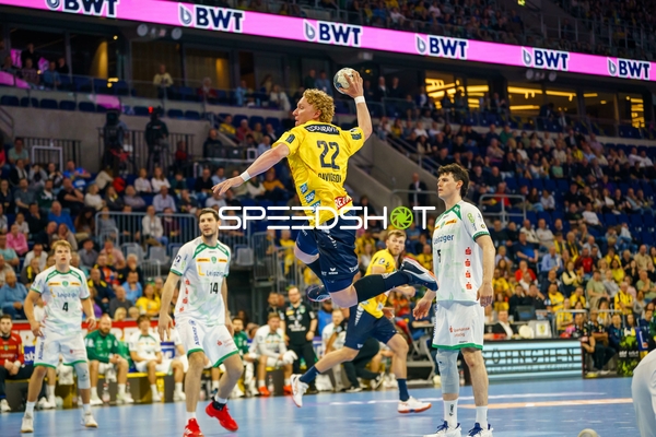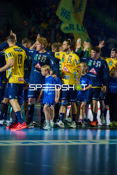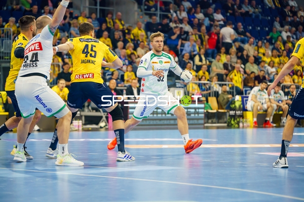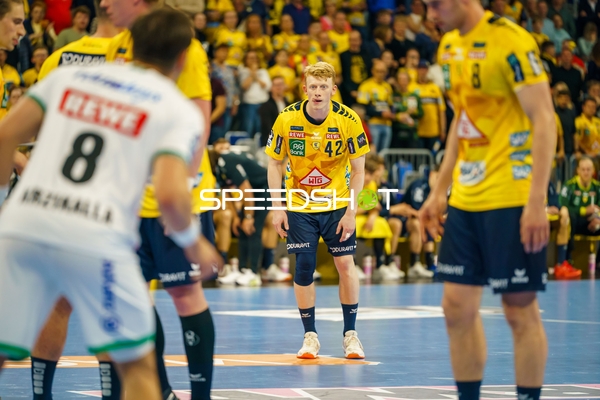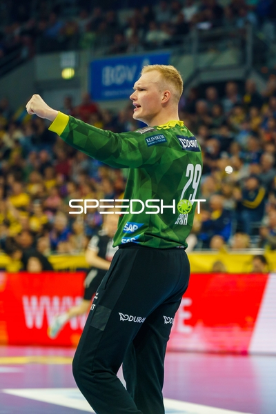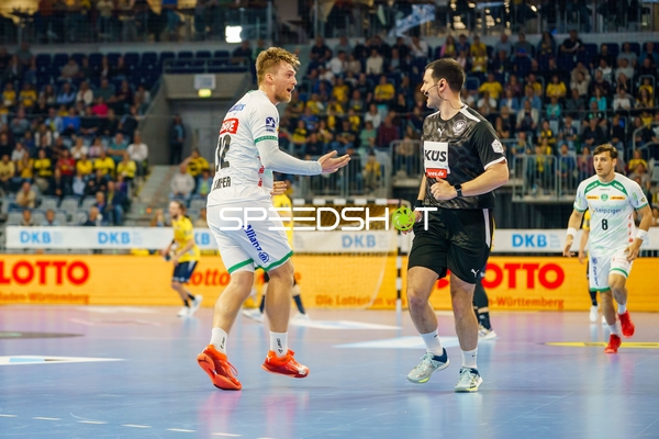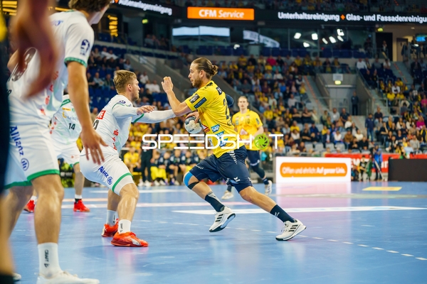 Jon Lindenchrone Andersen (42, Rhein Neckar Löwen) in Abwehr vor Lucas Krzikalla (8, SC DHfK Leipzig)