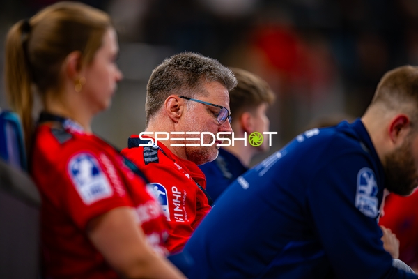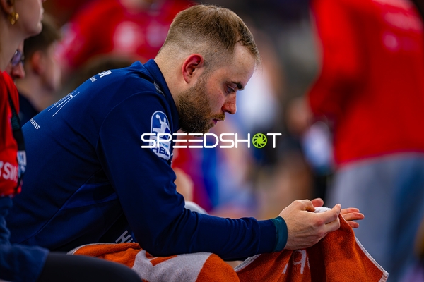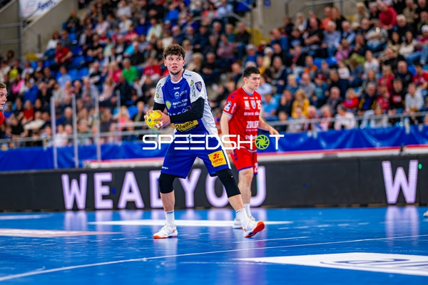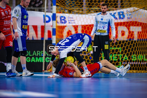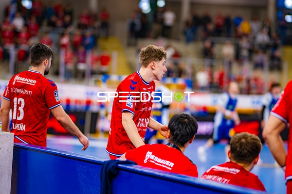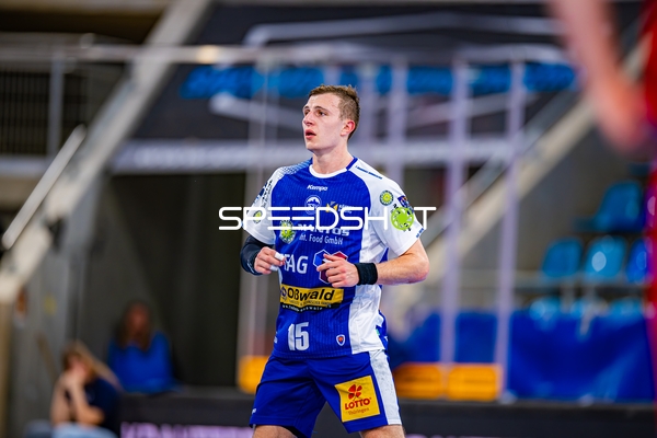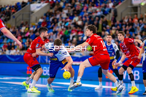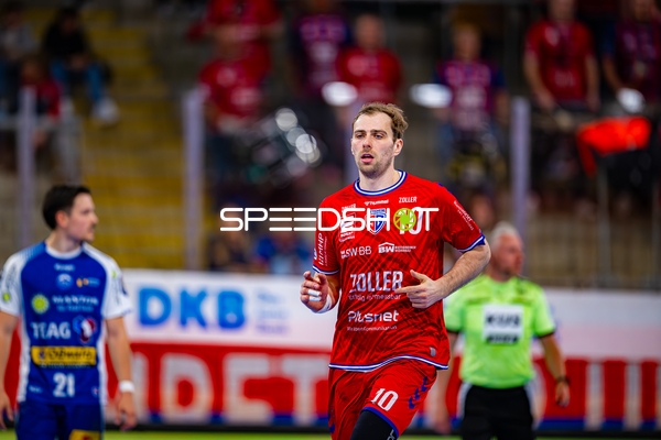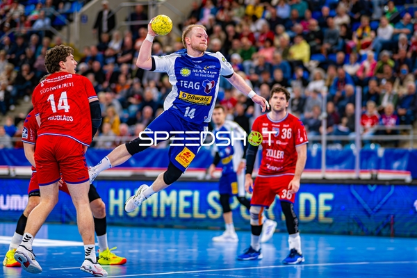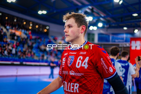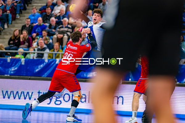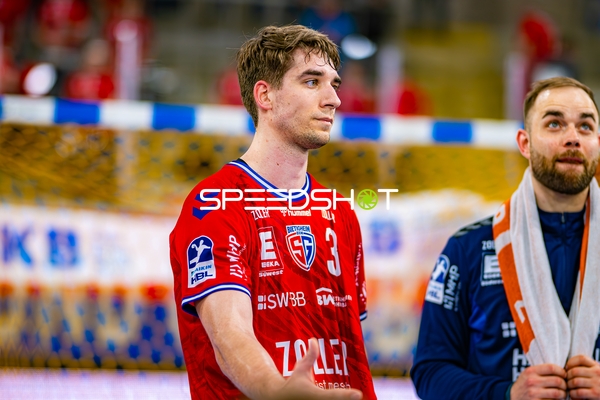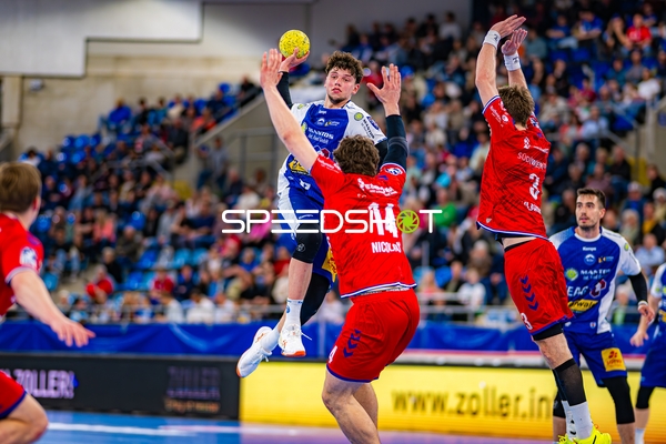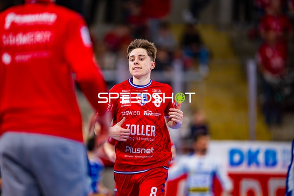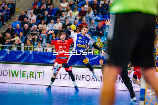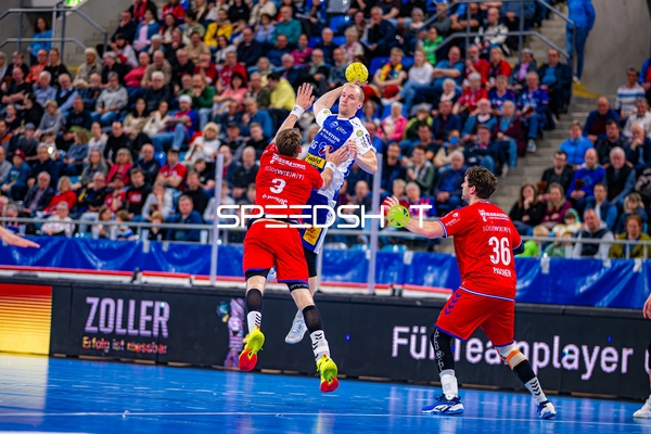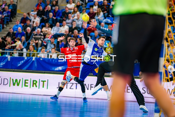 Nikola Vlahovic (3, SG BBM Bietigheim) und Jonathan Fischer (36, SG BBM Bietigheim) verteidigen Wurf