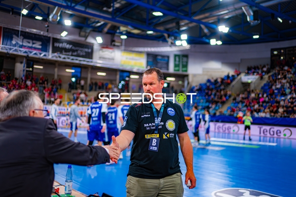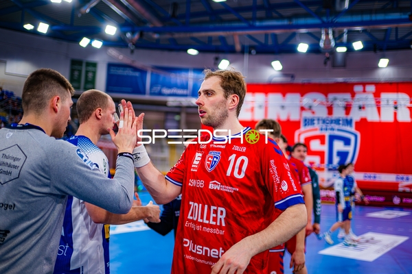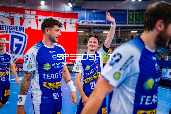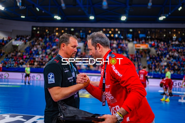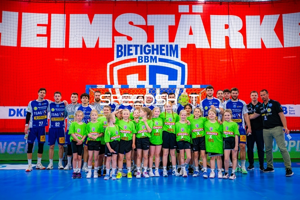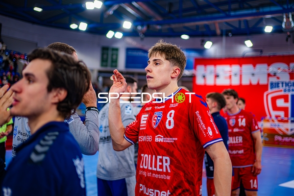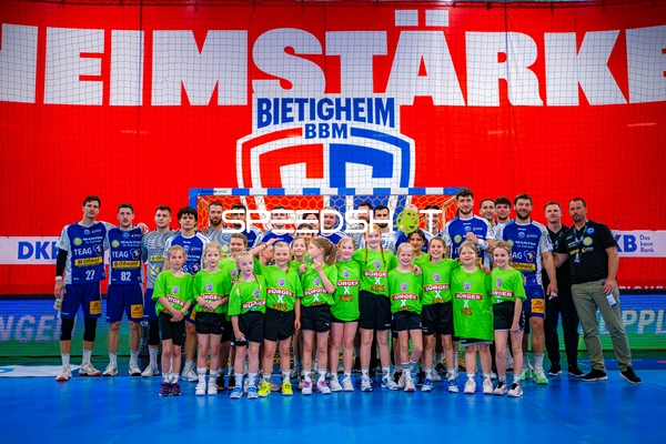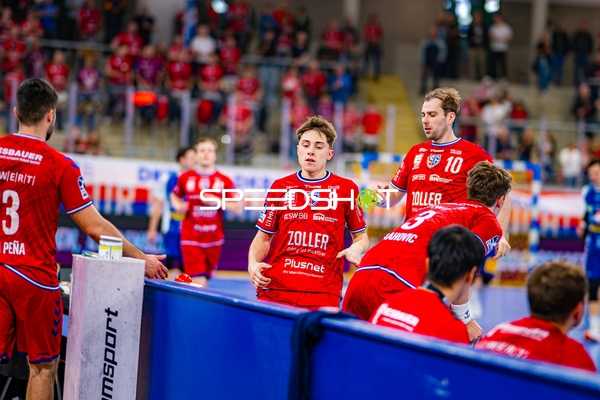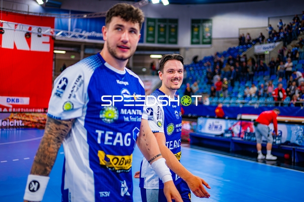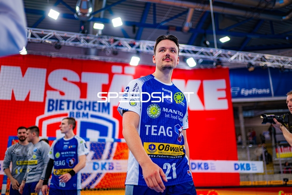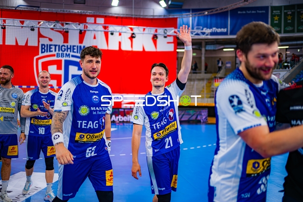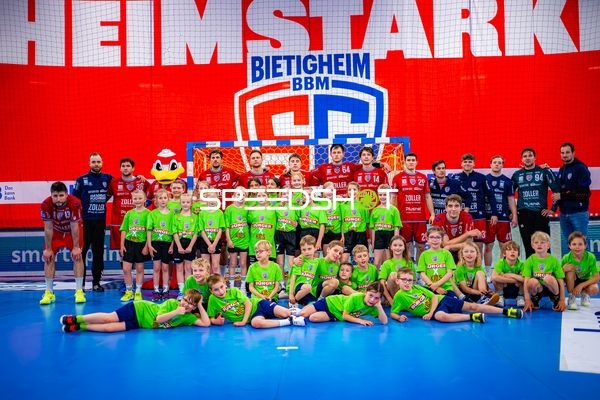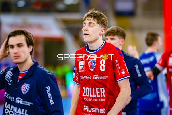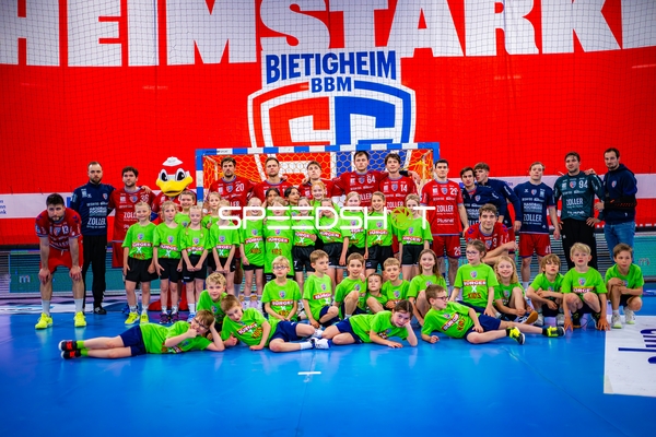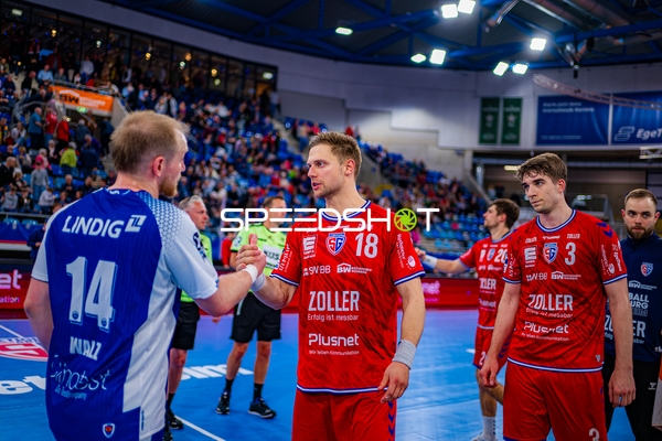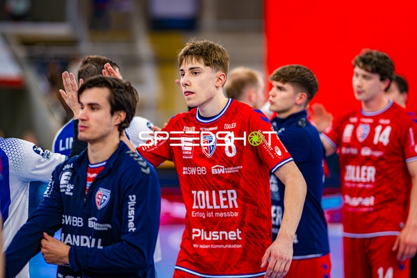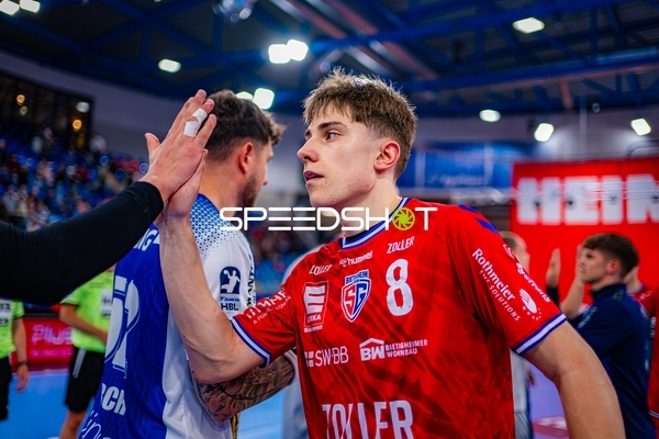 Fabian Wiederstein (18, SG BBM Bietigheim) und Nikola Vlahovic (3, SG BBM Bietigheim) begrüßen Gegner