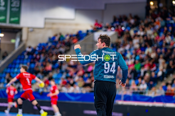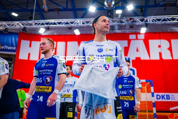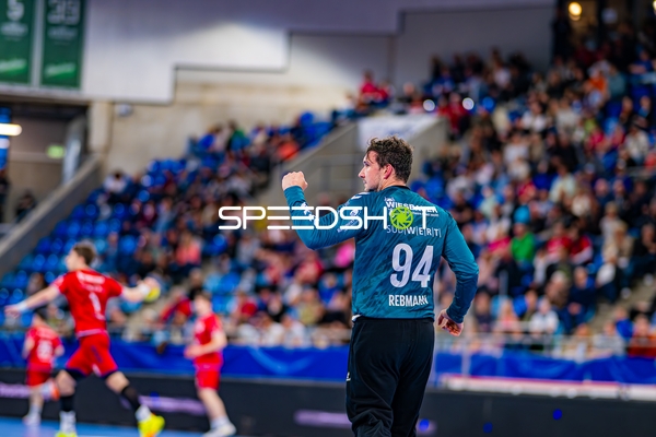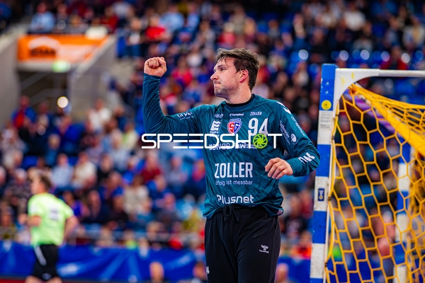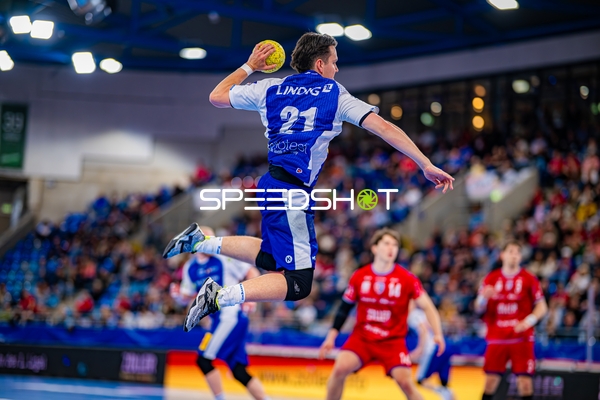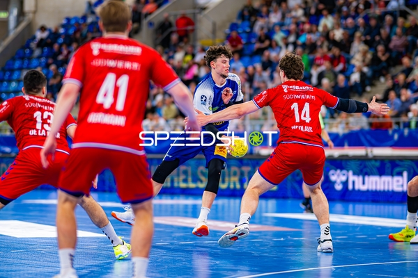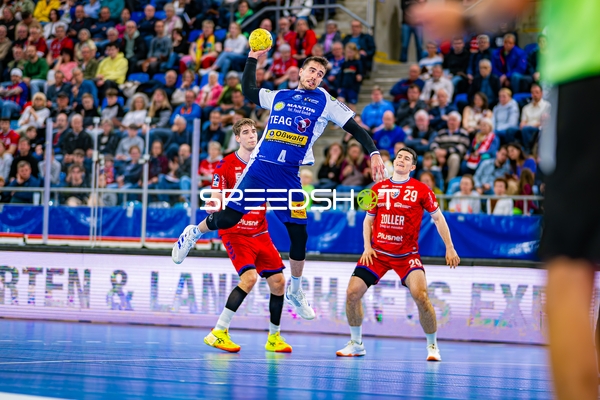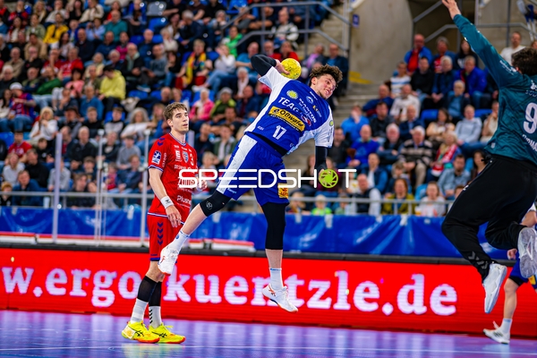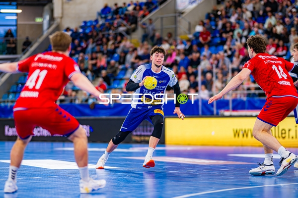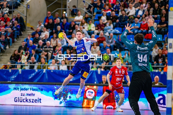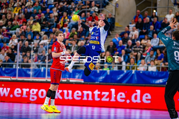 Marko Grgic (17, ThSV Eisenach) wirft gegen Fynn Nicolaus (14, SG BBM Bietigheim) und Nikola Vlahovic (3, SG BBM Bietigheim)
