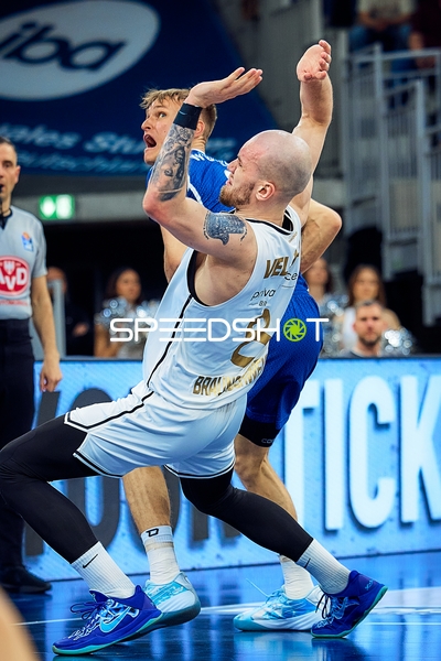 Spieler Tre Mitchell (3, Basketball Löwen Braunschweig) und Luka Ščuka (5, Basketball Löwen Braunschweig) auf Feld