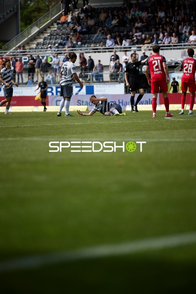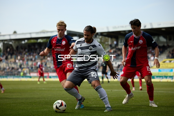 Abwehraktion Marco Schikora (21;SV Sandhausen), Justin Butler (10;SV Sandhausen), Benno Dietze (42;FC Hansa Rostock)