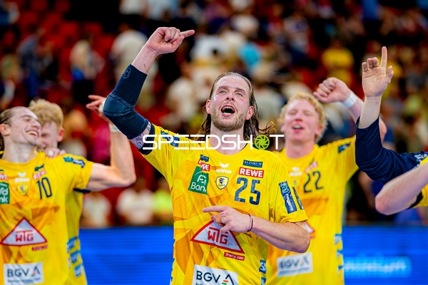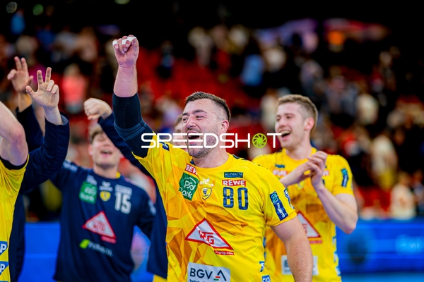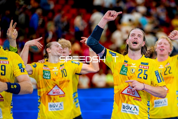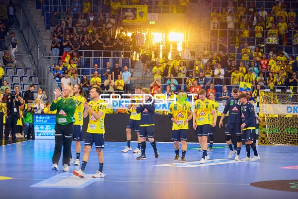 Feier nach Spielende Olle Forsell-Schefvert (25;Rhein Neckar Löwen), Juri Knorr (10;Rhein Neckar Löwen), Gustav Davidsson (22;Rhein Neckar Löwen), Patrick Groetzki (24;Rhein Neckar Löwen)