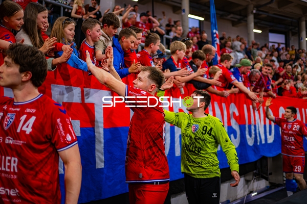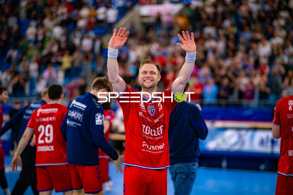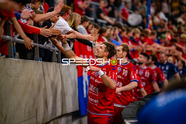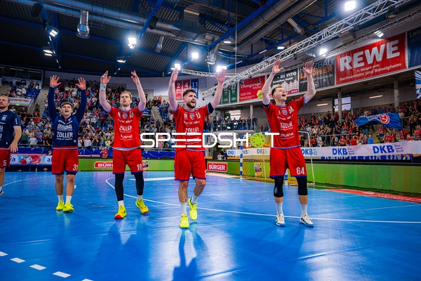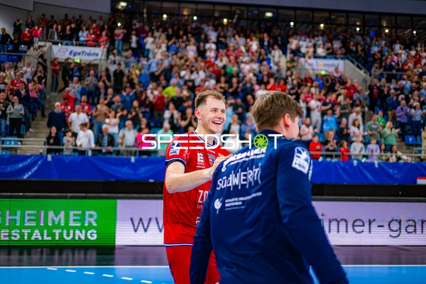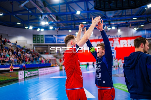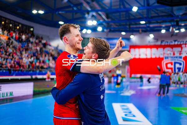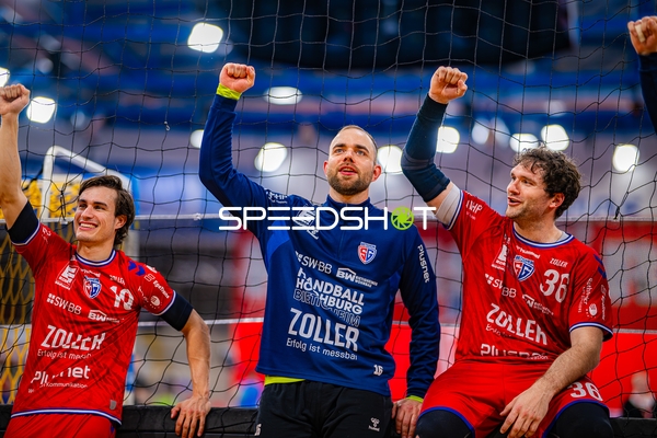 Feier nach Spiel Fredrik Genz (16;SG BBM Bietigheim), Alexander Pfeifer (31;SG BBM Bietigheim), Julius Kühn (5;SG BBM Bietigheim)