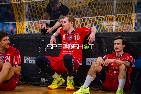 Halbzeitpause mit Alexander Pfeifer (31;SG BBM Bietigheim), Fredrik Genz (16;SG BBM Bietigheim), Jonathan Fischer (36;SG BBM Bietigheim)