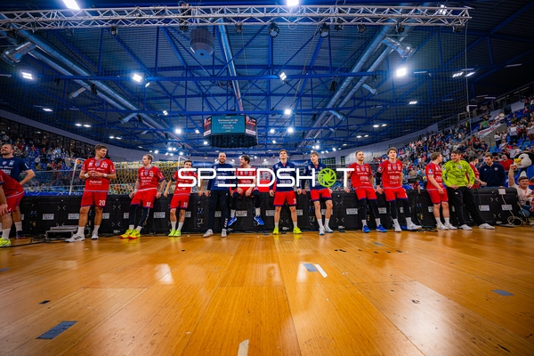 Team celebration Juan De la Pena (13;SG BBM Bietigheim), Nikola Vlahovic (3;SG BBM Bietigheim), Fredrik Genz (16;SG BBM Bietigheim)