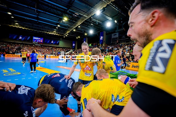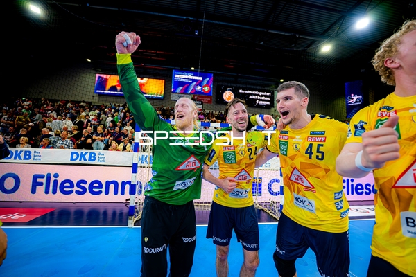 Feier nach Spielende Patrick Groetzki (24;Rhein Neckar Löwen), Olle Forsell-Schefvert (25;Rhein Neckar Löwen), Jannik Kohlbacher (80;Rhein Neckar Löwen)