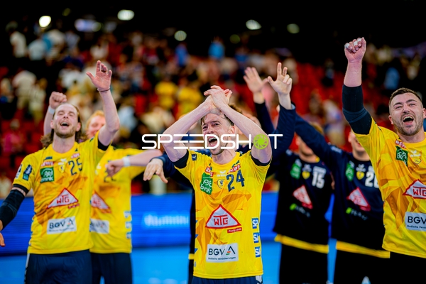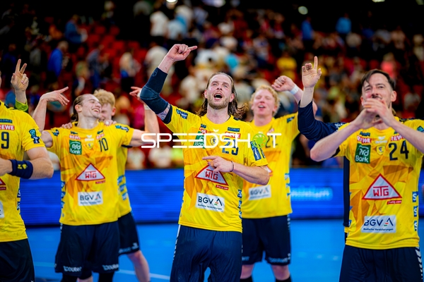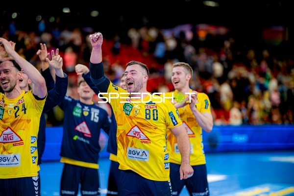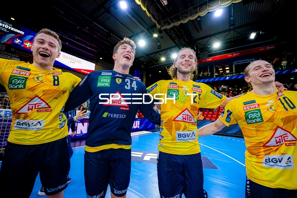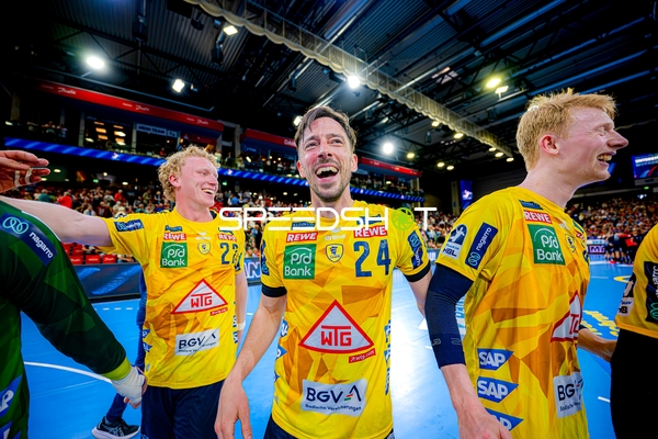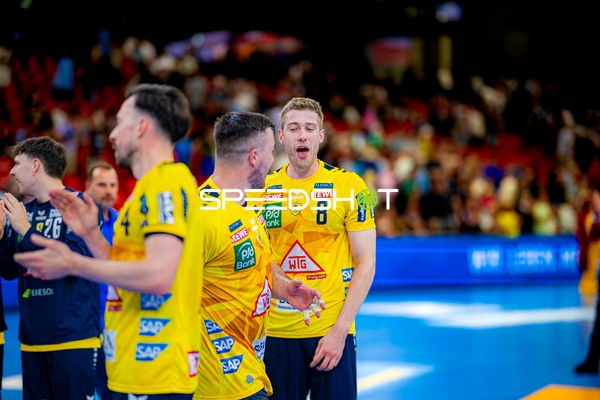 Feier nach Spielende Olle Forsell-Schefvert (25;Rhein Neckar Löwen), Juri Knorr (10;Rhein Neckar Löwen), Gustav Davidsson (22;Rhein Neckar Löwen), Patrick Groetzki (24;Rhein Neckar Löwen)