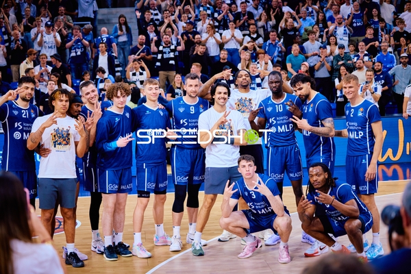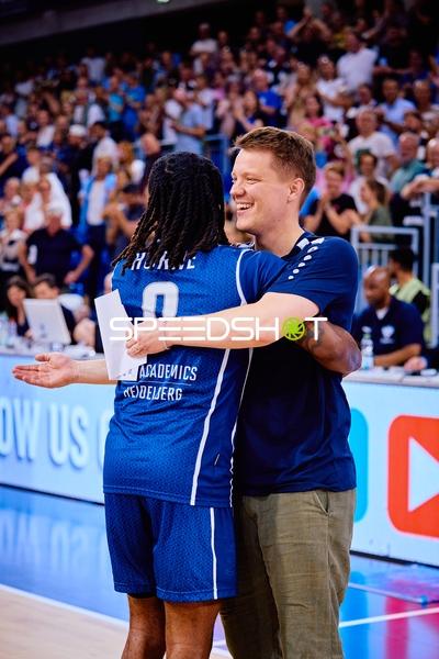 Feier mit Andrew O’Brien (3;MLP Academics Heidelberg), Osun Osunniyi (12;MLP Academics Heidelberg), Dominic Vengert (8;MLP Academics Heidelberg), Erol Ersek (11;MLP Academics Heidelberg)