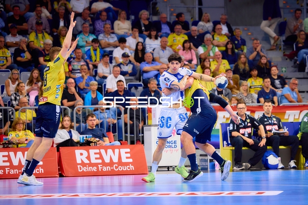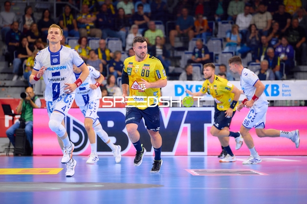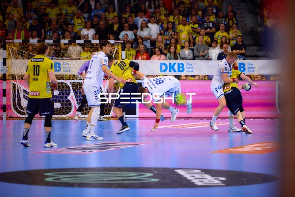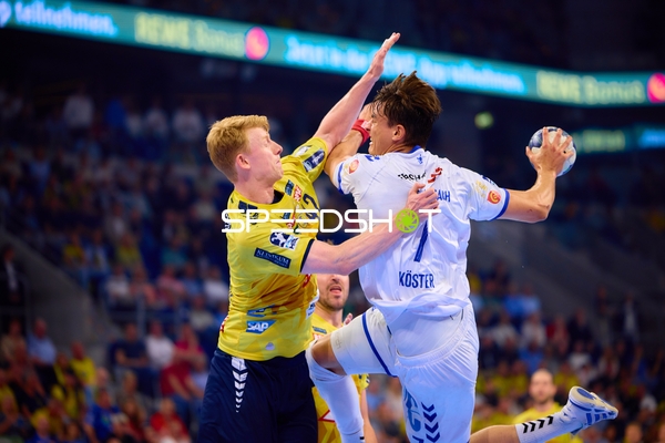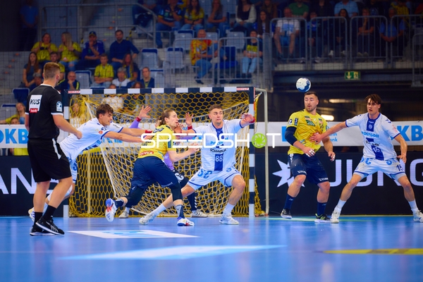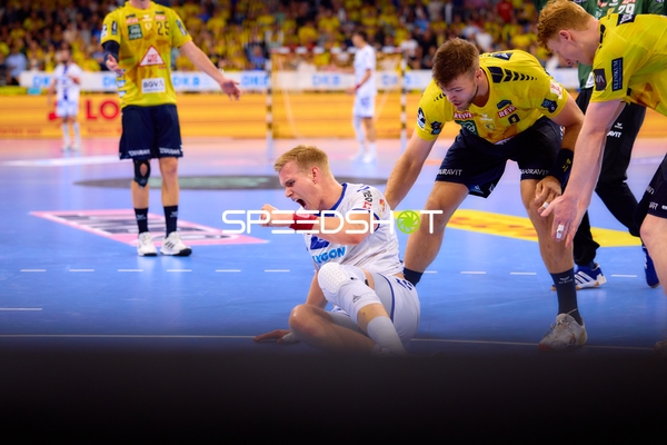 Wurf aufs Tor Julian Koester (7;VfL Gummersbach) vs Jon Lindenchrone Andersen (42;Rhein Neckar Löwen)