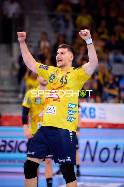 Patrick Groetzki (24, Rhein Neckar Löwen) und Jon Lindenchrone Andersen (42, Rhein Neckar Löwen) jubeln