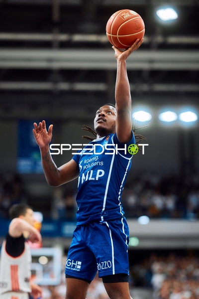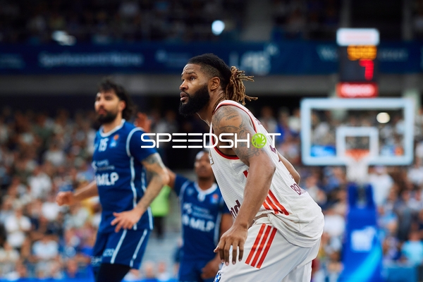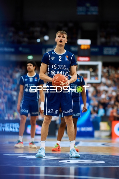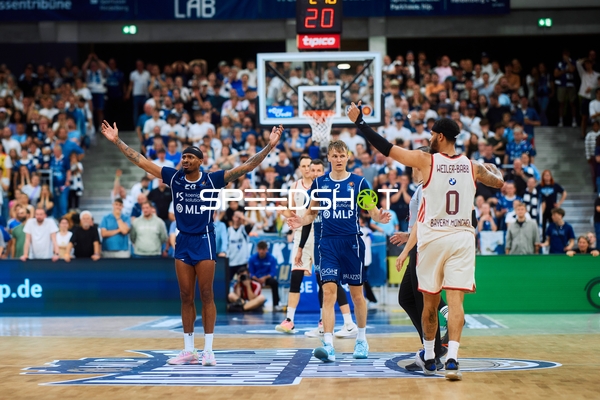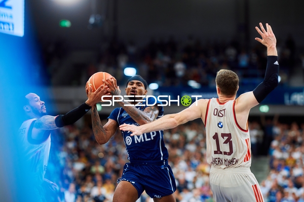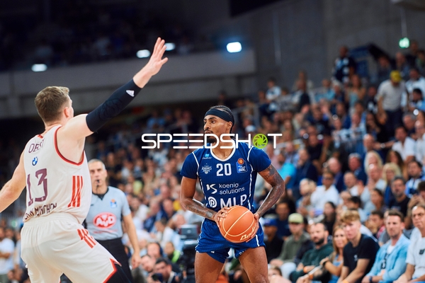Zweikampf Michael Weathers (20; MLP Academics Heidelberg) gegen Andreas Obst (13; FC Bayern Basketball)