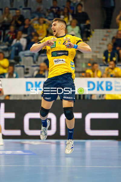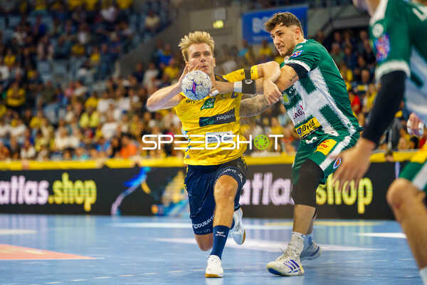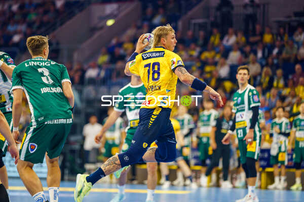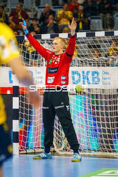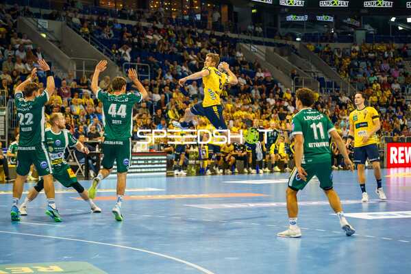 Dani Baijens (77; Rhein Neckar Löwen) im Angriff gegen Peter Walz (14; ThSV Eisenach) und Oskar Joelsson (3; ThSV Eisenach)