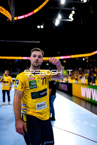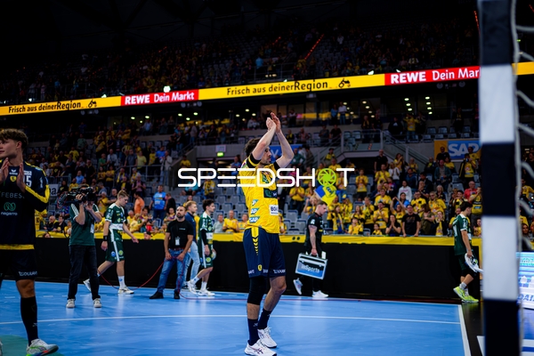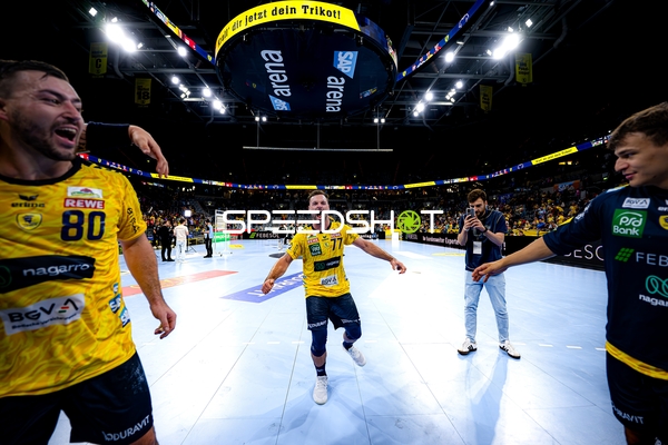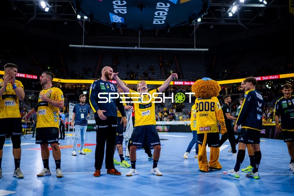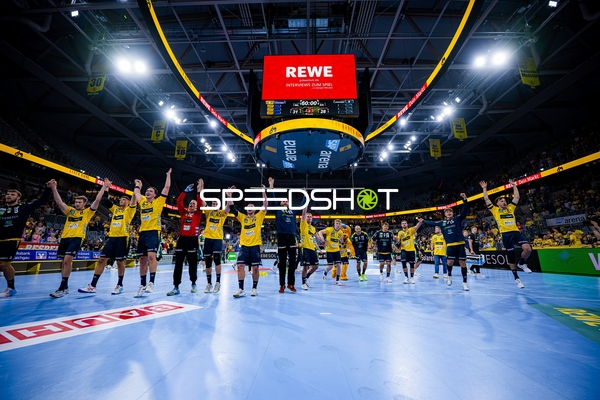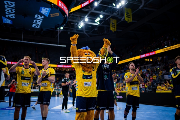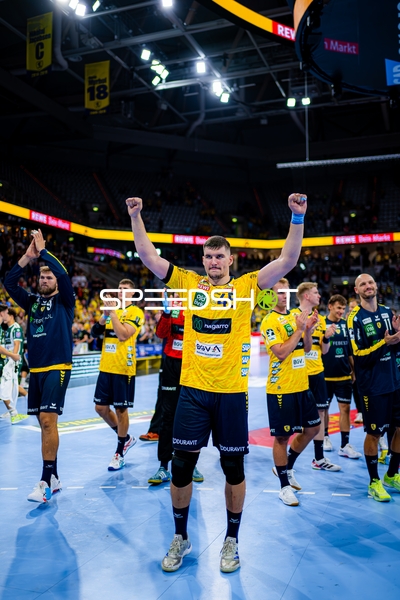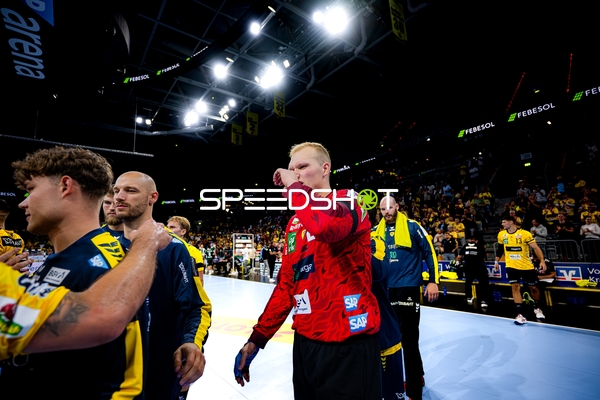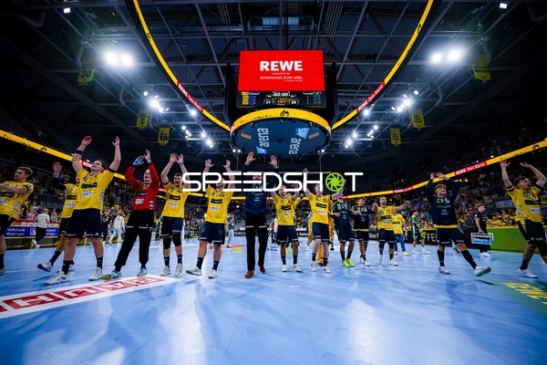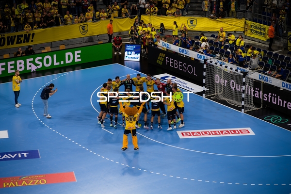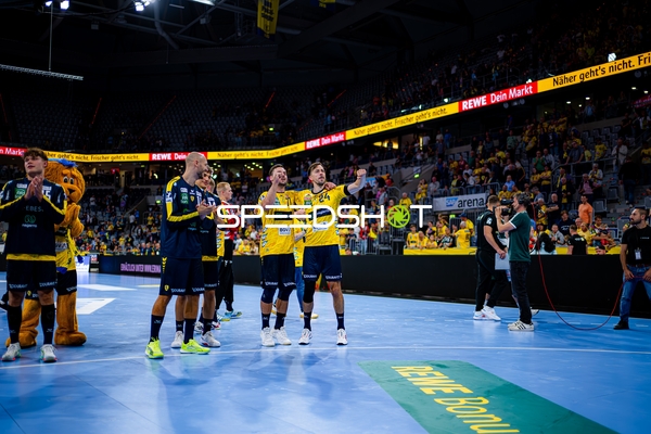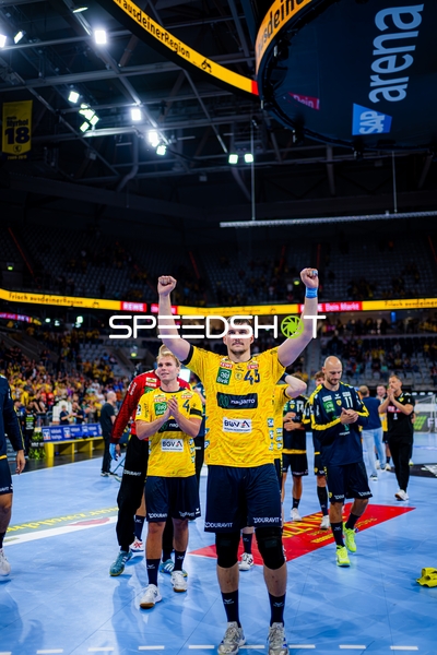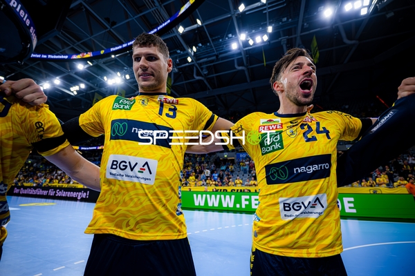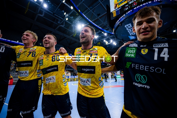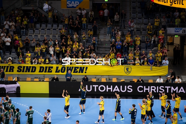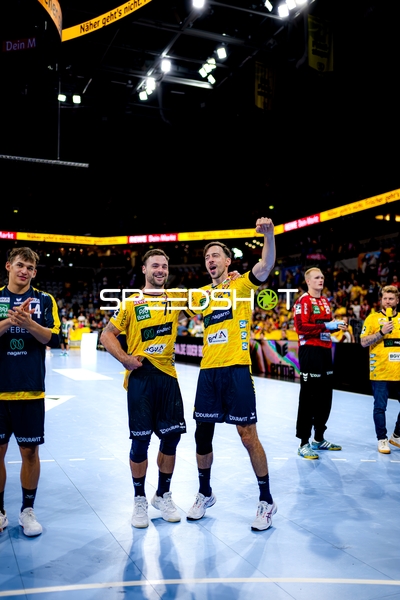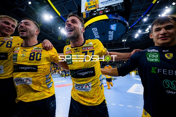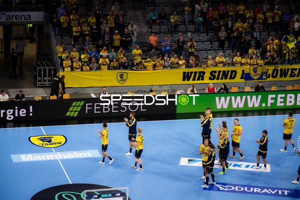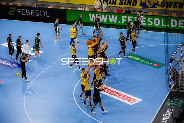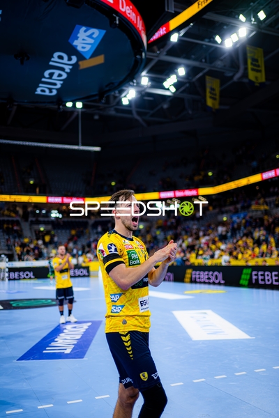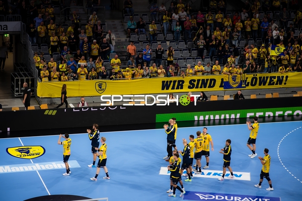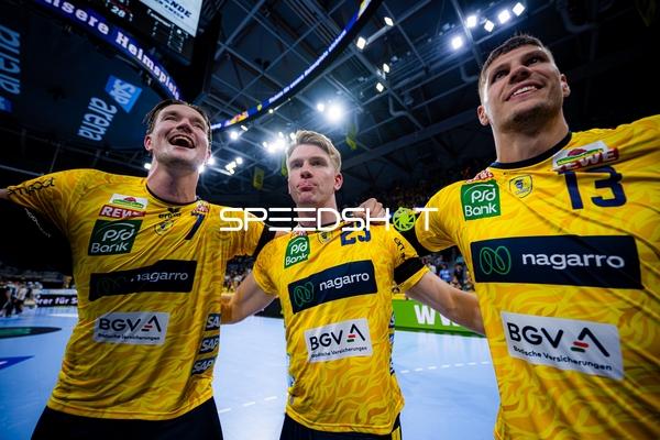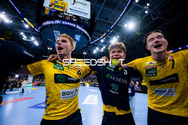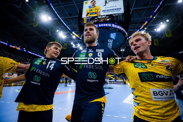 Jubel bei Jannik Kohlbacher (80; Rhein Neckar Löwen), Dani Baijens (77; Rhein Neckar Löwen) und Gino Steenaerts (14; Rhein Neckar Löwen)