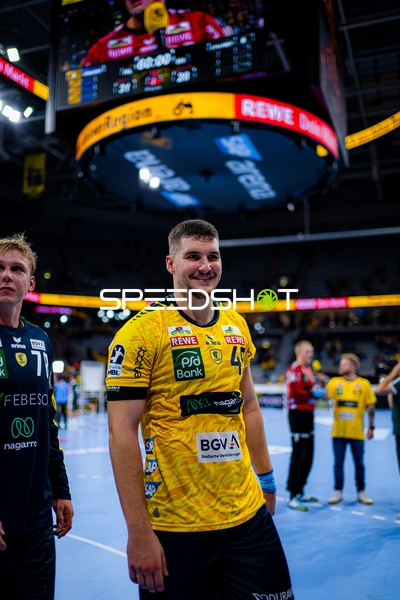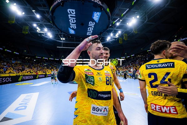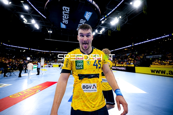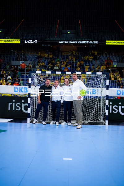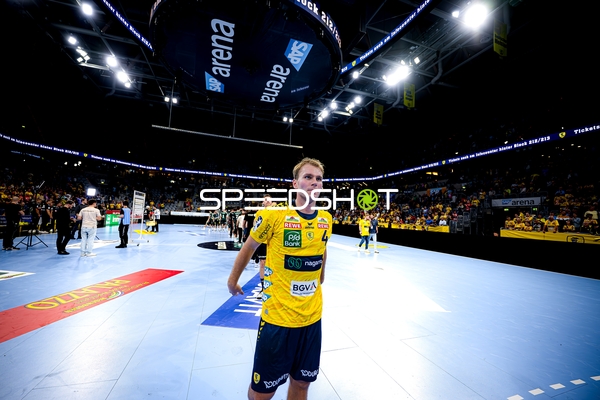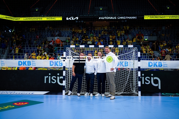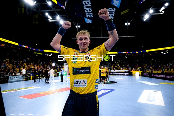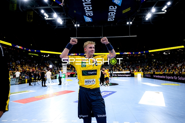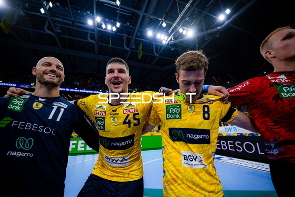 Dani Baijens (77; Rhein Neckar Löwen), Jannik Kohlbacher (80; Rhein Neckar Löwen), Edwin Aspenbäck (78; Rhein Neckar Löwen) und Gino Steenaerts (14; Rhein Neckar Löwen) feiern gemeinsam