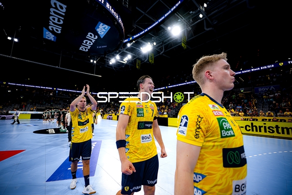 Patrick Groetzki (24; Rhein Neckar Löwen), Lukas Sandell (11; Rhein Neckar Löwen) und Halil Jaganjac (45; Rhein Neckar Löwen) jubeln gemeinsam