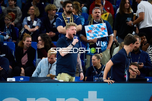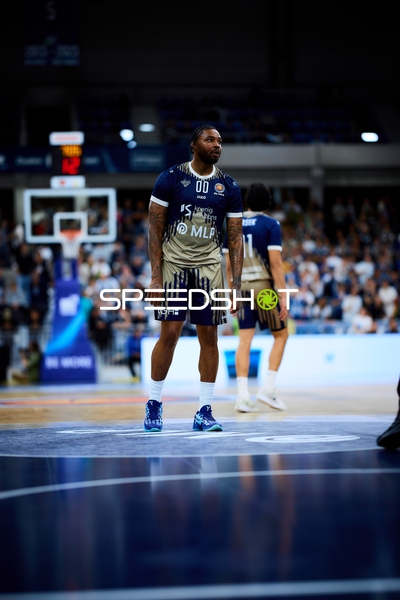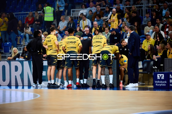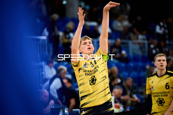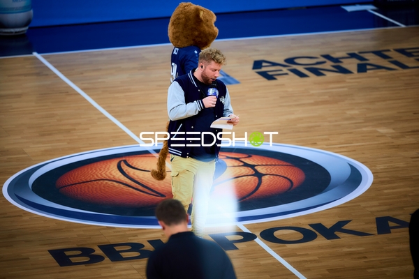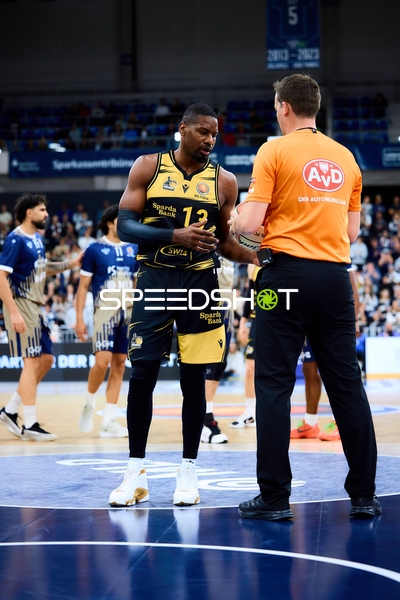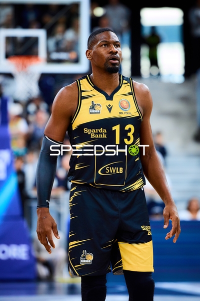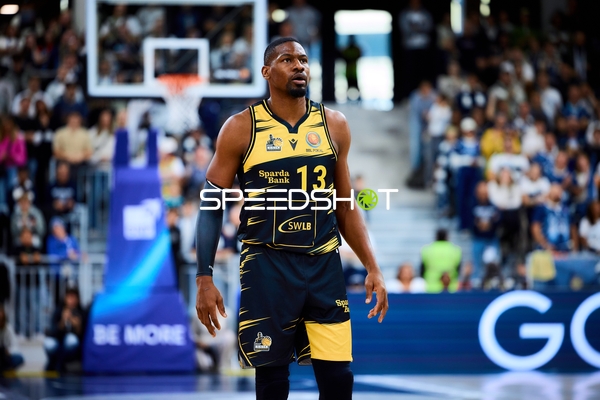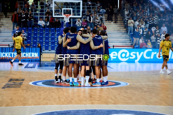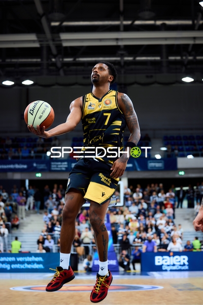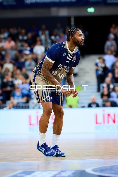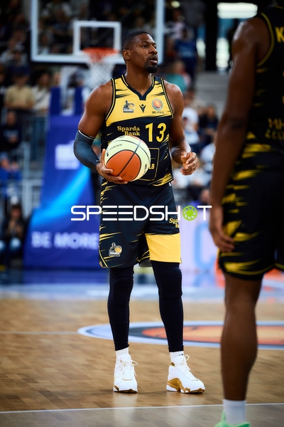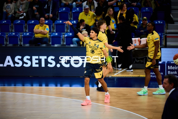 Brandon Tischler (24; MHP Riesen Ludwigsburg) wirft, Julis Baumer (37; MHP Riesen Ludwigsburg) und Keeshawn Kellman (32; MHP Riesen Ludwigsburg) bereit