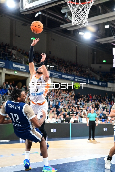 Kendale McCullum (10; Promitheas Patras Vikos Cola) wirft über Osun Osunniyi (12; MLP Academics Heidelberg)