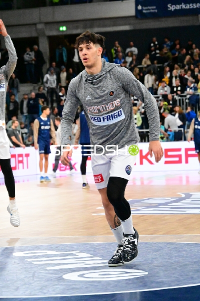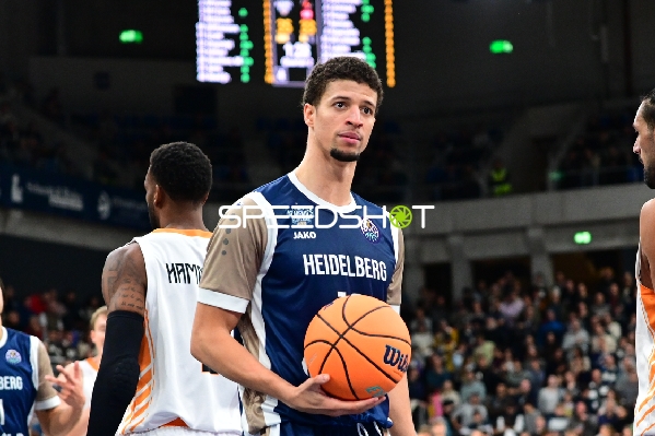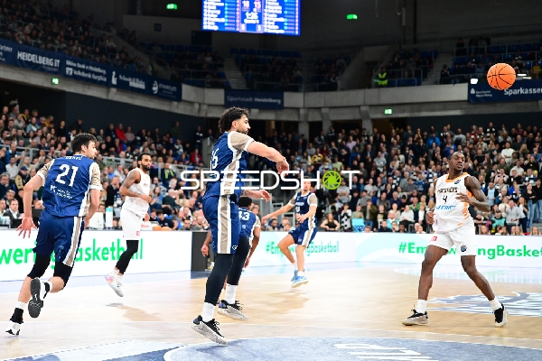 Marcel Keßen (15; MLP Academics Heidelberg) passt zu Mateo Seric (21; MLP Academics Heidelberg) unter Druck von Kendal Coleman (4; Promitheas Patras Vikos Cola)