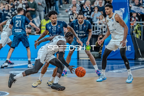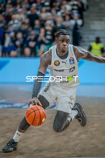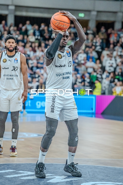 Szene mit Osun Osunniyi (12; MLP Academics Heidelberg) und David NGuessan (1; Basketball Löwen Braunschweig)