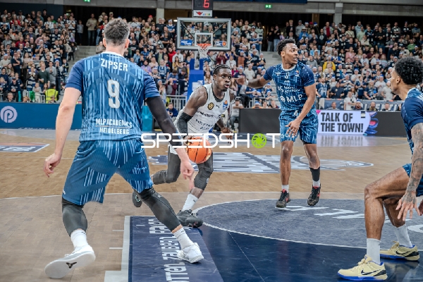 Spielaktion mit Marcus Weathers (00; MLP Academics Heidelberg) und David NGuessan (1; Basketball Löwen Braunschweig)