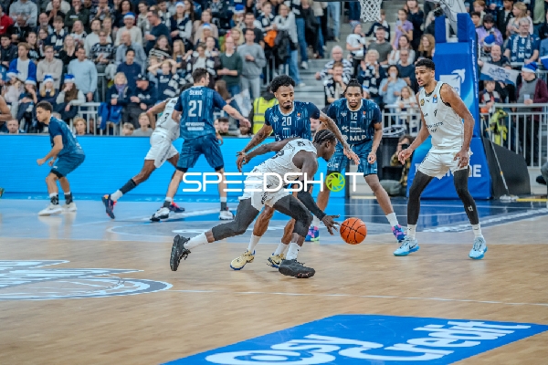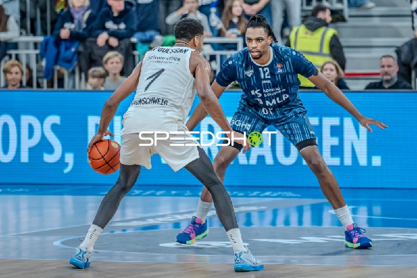 Cavit Gürbüzer (4; Basketball Löwen Braunschweig) mit Ball, DJ Horne (0; MLP Academics Heidelberg) verteidigt