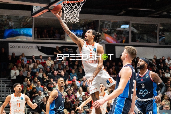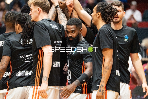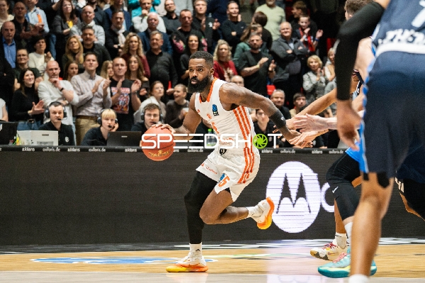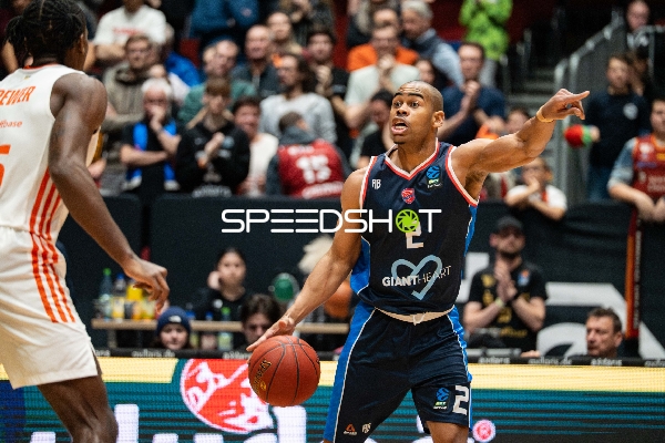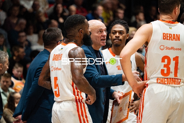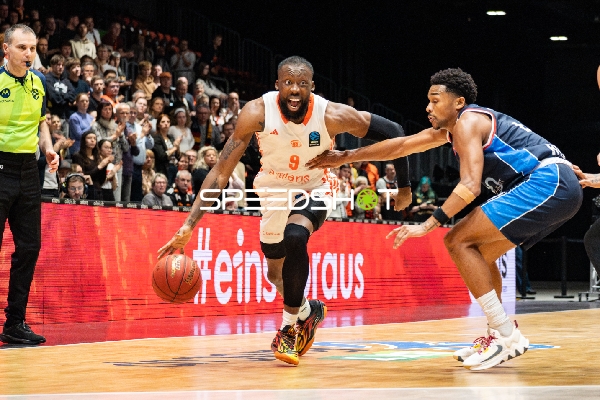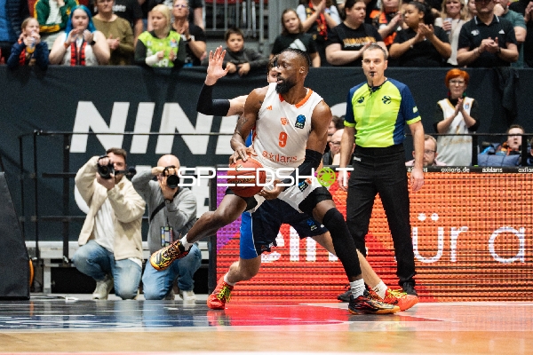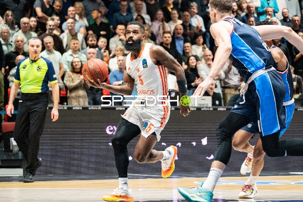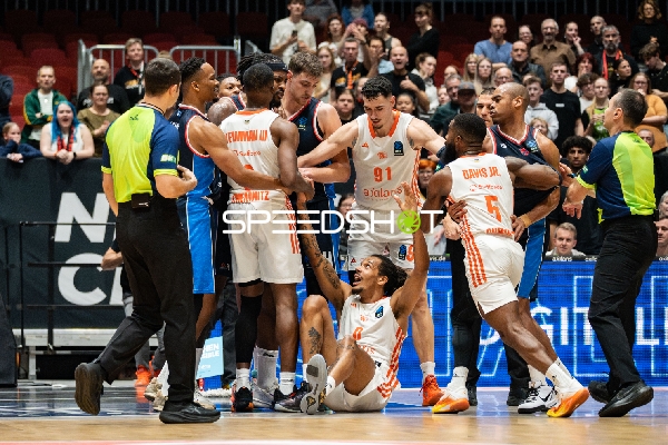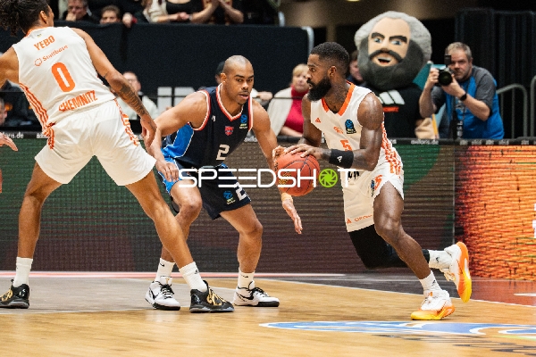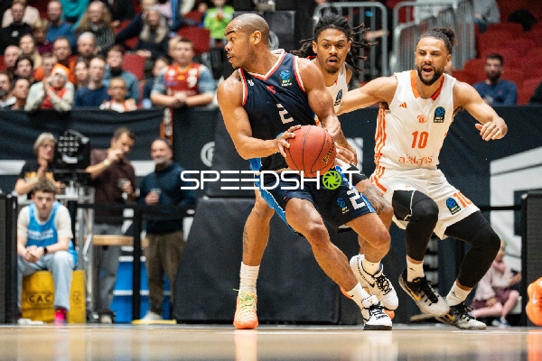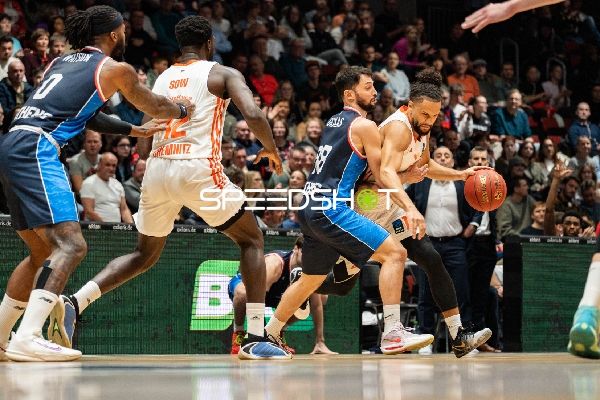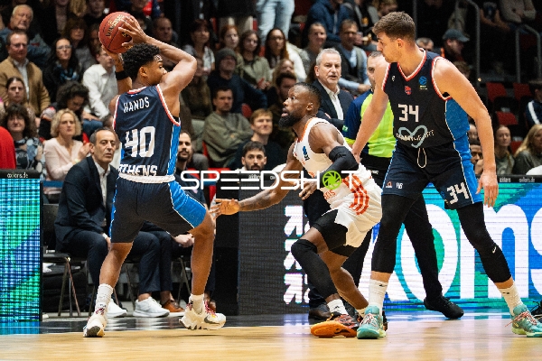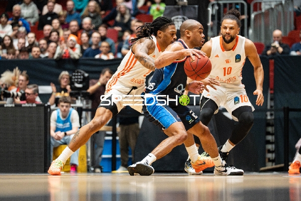 Jaylen Hands (40; Panionios Athen) mit Ball gegen John Newman III (9; NINERS Chemnitz) und 88; NINERS Chemnitz