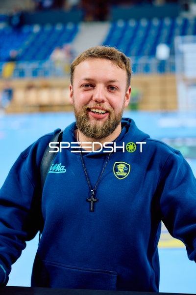 Spieler der Rhein Neckar Löwen mit Mikrofon in der Hand auf dem Spielfeld.