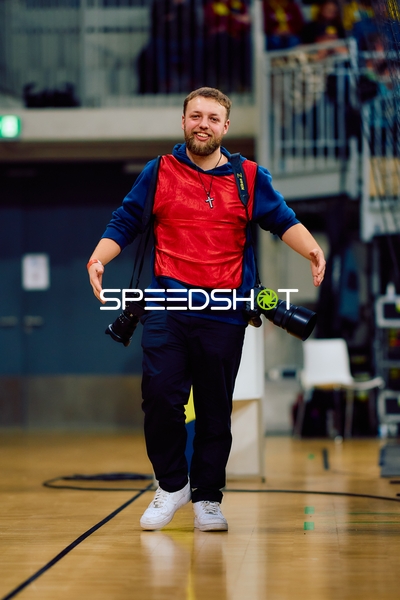 Interaktion zwischen einem Handballspieler und TV-Personal am Spielfeldrand.