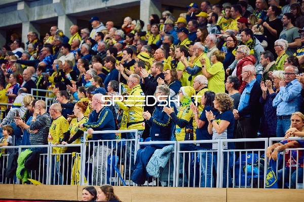 Ein Handballspiel findet in einem vollbesetzten Stadion statt.