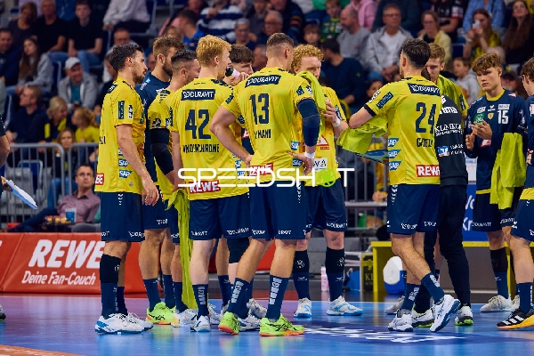 Ein Spieler der Rhein Neckar Löwen, vermutlich David Späth, signalisiert eine Spielstrategie.