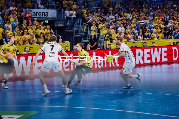 Ein Spieler von Rhein Neckar Löwen springt, um einen Wurf zu machen, während Spieler von THW Kiel versuchen zu blocken.