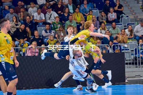 Spieler Nummer 25 von Rhein Neckar Löwen springt, um den Ball zu fangen oder zu blocken.