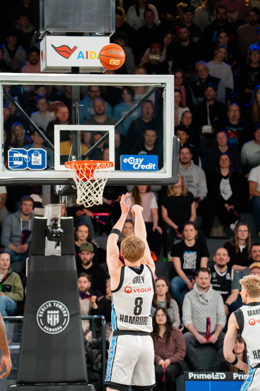 Jared Grey (8; Veolia Towers Hamburg) mit Wurf am Korb