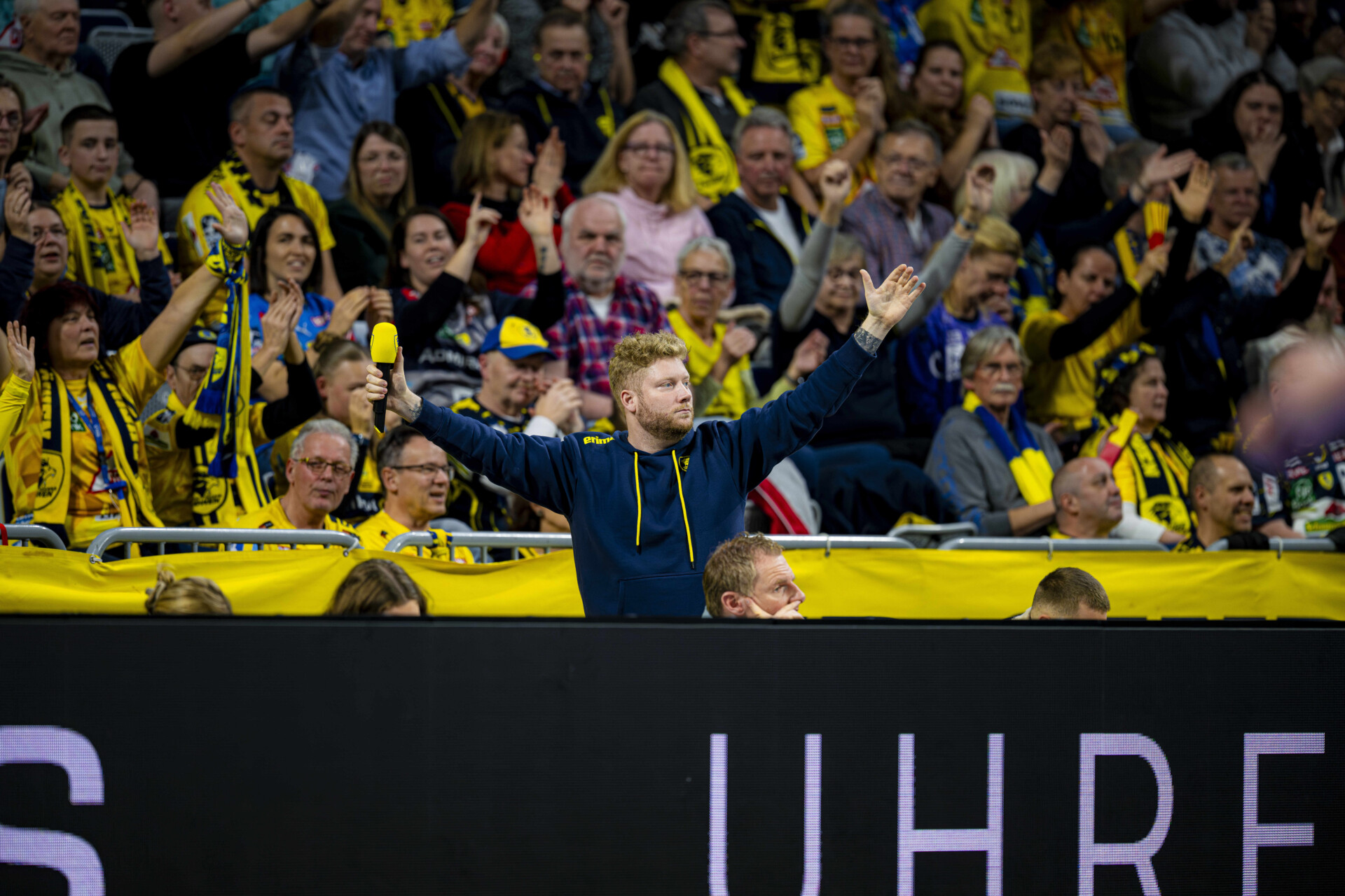 Szene mit Robert Timmermeister (7; Rhein Neckar Löwen) und Moderatorin