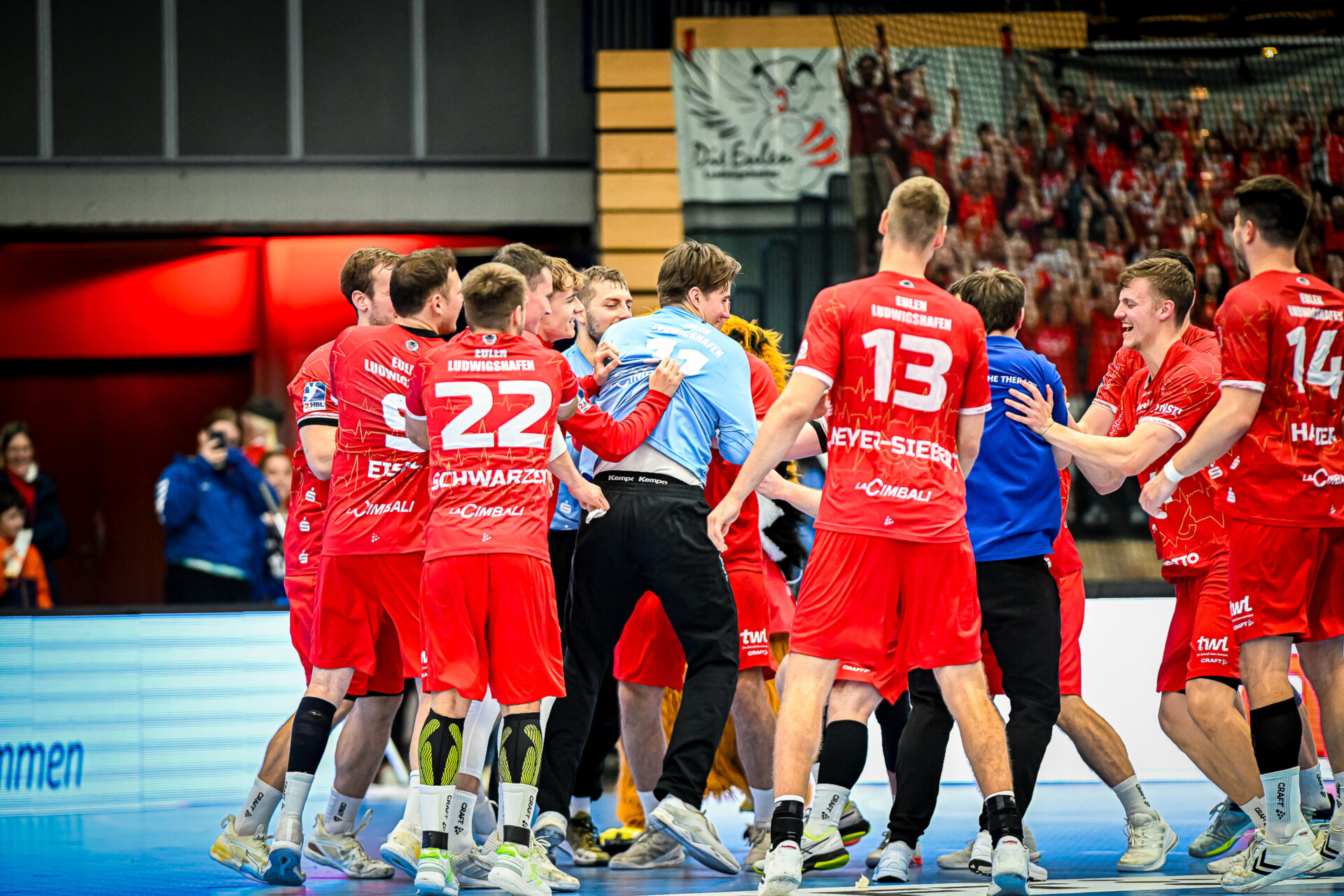 Der Jubel bei den Spielern von Eulen Ludwigshafen kennt keine Grenzen, Jannek Klein